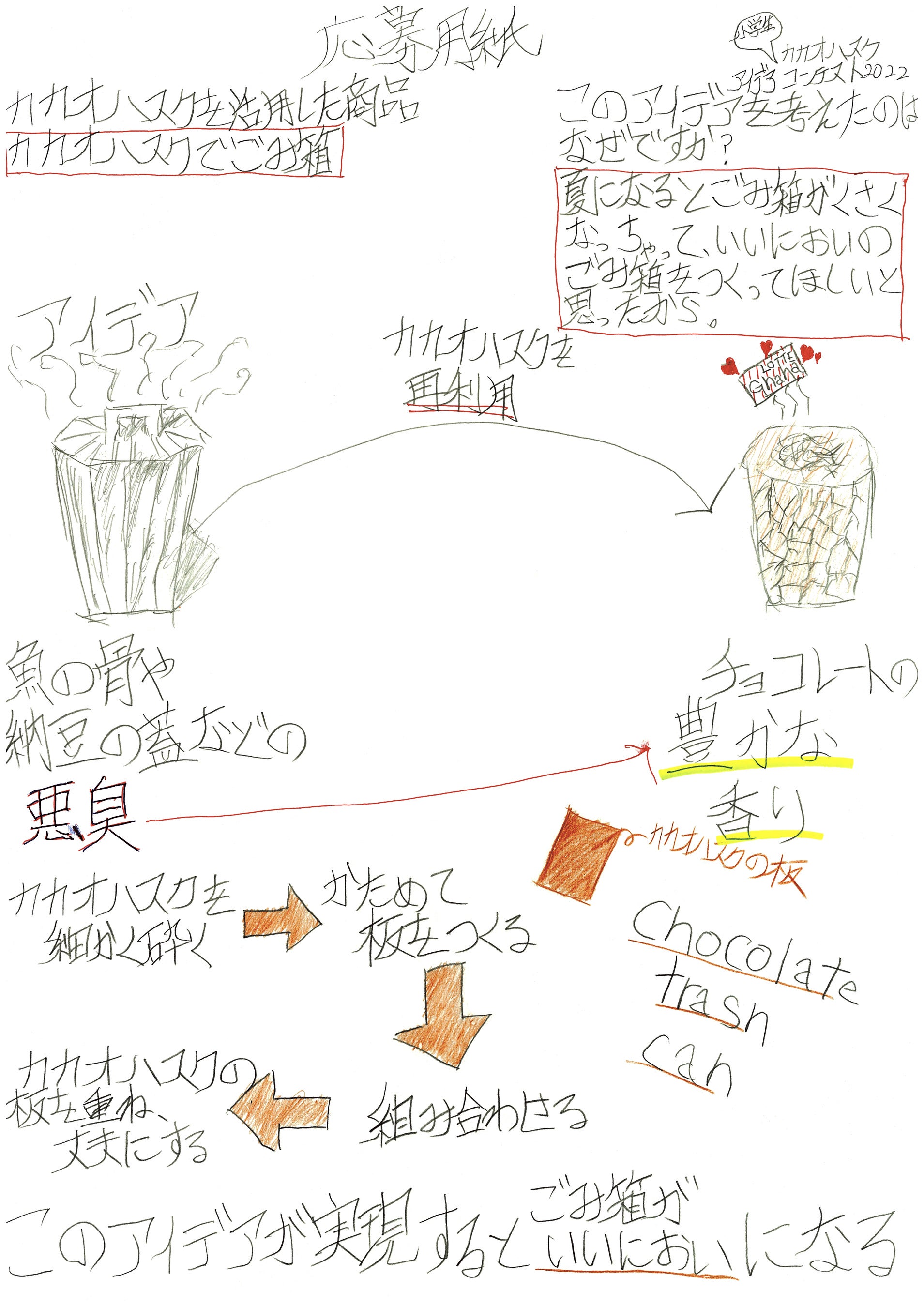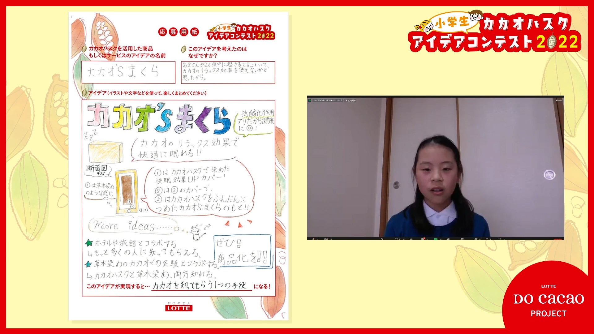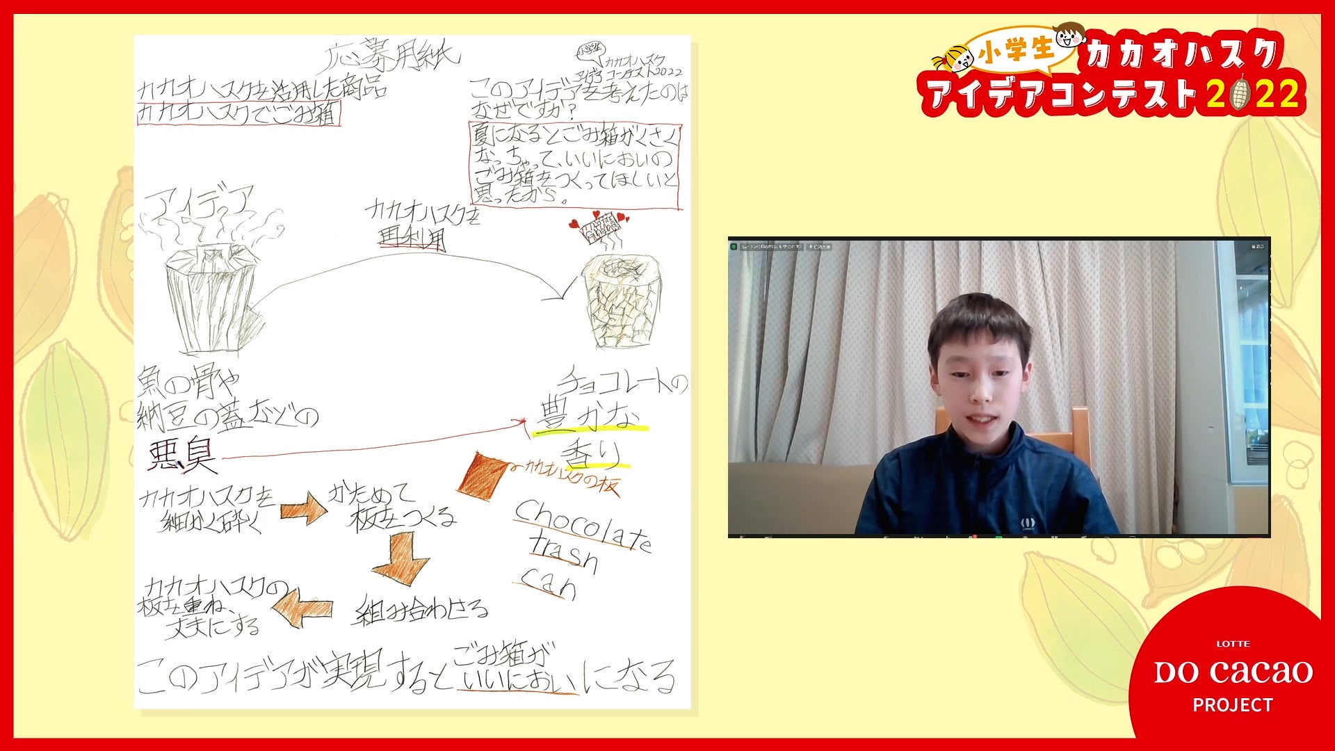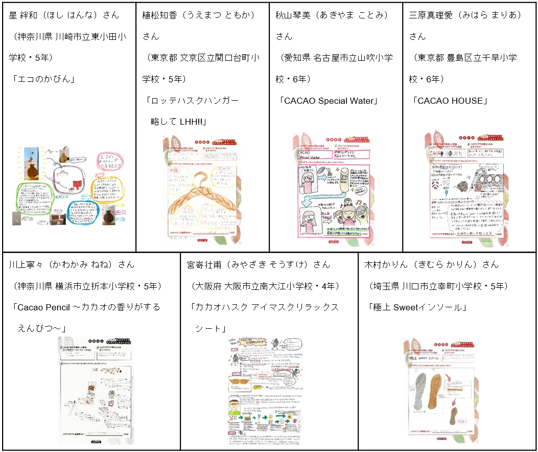 株式会社ロッテ(本社:東京都新宿区)は、持続可能な社会を目指し、人々のウェルビーイングのため、カカオの可能性を最大限に広げる活動「LOTTE DO Cacao PROJECT」の一環として、「小学生カカオハスクアイデアコンテスト2022」を実施いたしました。このコンテストはカカオハスク(チョコレートの製造工程で発生するカカオ豆の皮)の、未来に繋がる新しい活用方法を、子どもたちと一緒に考えたいという思いから、小学4年生~6年生を対象に募集し、全国から200作品以上と多くのご応募をいただきました。