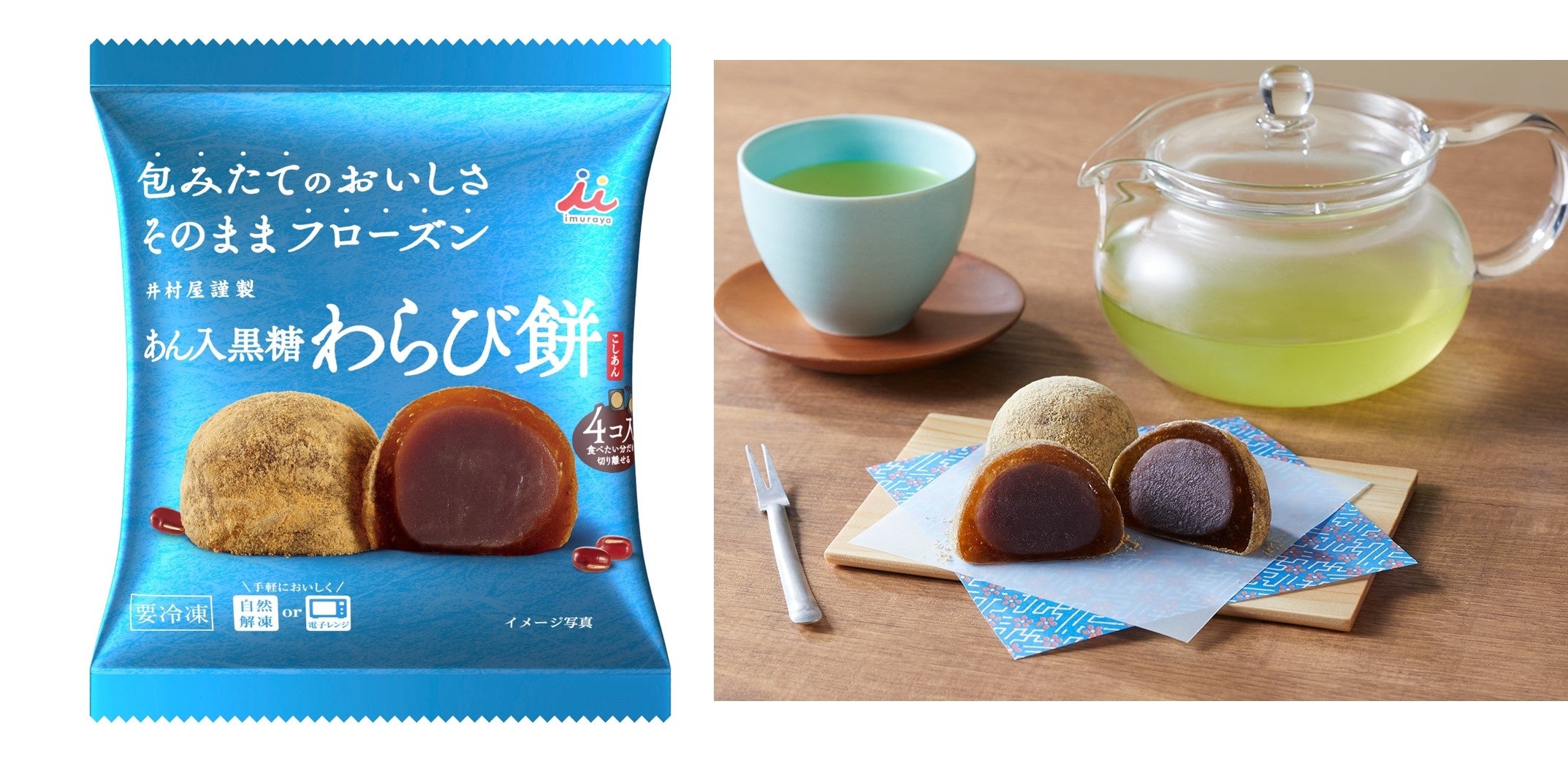 急速冷凍することで、包みたてのようなおいしさをご家庭でいつでも手軽に楽しめる「冷凍和菓子シリーズ」の大福・きなこおはぎ・あん入黒糖わらび餅も全国の量販店・スーパー、井村屋ウェブショップにて好評販売中です。