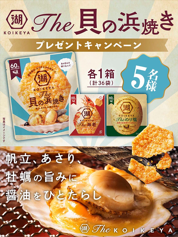 「KOIKEYA The 貝の浜焼き」の発売を記念して、「KOIKEYA The のり塩」「KOIKEYA The 海老」とセットで各1箱(計36袋)を抽選で5名様にプレゼントするキャンペーンを実施します。コイケヤ【公式】(@koikeya_cp)をフォローいただき、キャンペーンツイートをリツイートすると応募完了です。当選者の方のみ、その場でコイケヤ【公式】アカウント(@koikeya_cp)よりダイレクトメッセージが届きます。