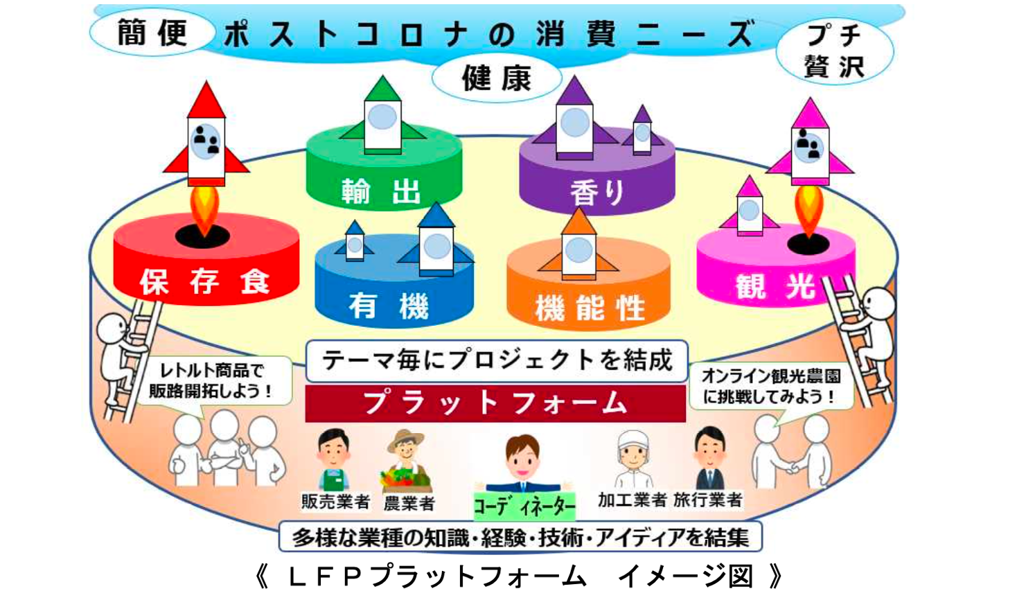 宮崎県の強みである地域食資源の高付加価値化に向けた取組を強化するため、新たな生活様式や消費ニーズに対応した新商品・新サービスの開発を目指し、食と農に関する多様な関係者が参画して、各々の知識・技術・経験等を結集する“みやざきLFPプラットフォーム”を設置しました。みやざきLFPプラットフォームの特徴は、食品関連に限らず幅広い業種の事業者が参画していることで、令和 5 年 1月 31 日時点で 187 事業者(農林漁業者、加工・販売業者、観光業者、大学、地域商社など)が入会しています。
