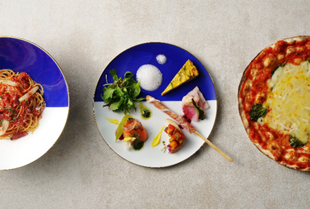 全てのお皿は有田焼で提供し、毎月九州の食材をメインにしつつ、美味しい食材に『境』をつくらず、旬の食材をイタリア各地の調理法を取り入れて作るマルゴアンティパストからはじまるセットメニューをお楽しみいただけます。
