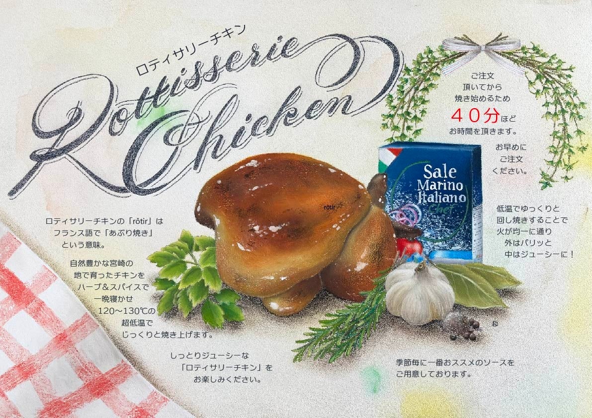 シグネチャーメニューである『ロティサリーチキン』、『窯焼きピザ』はこだわりや作り方をより楽しく伝えるためにチョークアートで表現。チョークアートは日本一に輝いた実績のあるGraffiti-Factory 田島奈保氏。