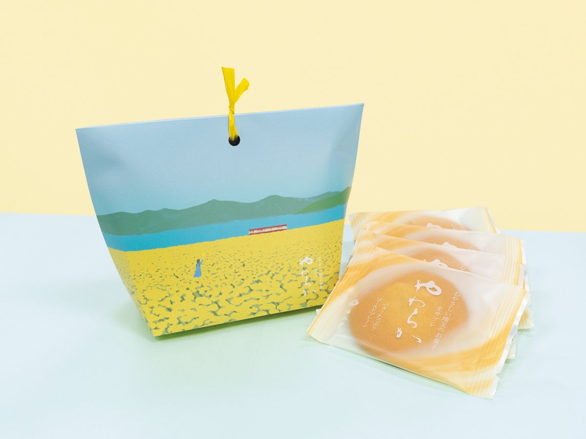 やわらかのお菓子作りで大切にしている「一袋のお菓子におかあさんの心をそえてあげること」。そんな母のあたたかさは、まるで太陽のよう、という気持ちを込めて、少年(シゲル)が山で過ごすある夏の1日を、太陽がやわらかく見守る風景を描いています。(いえだゆきな氏)