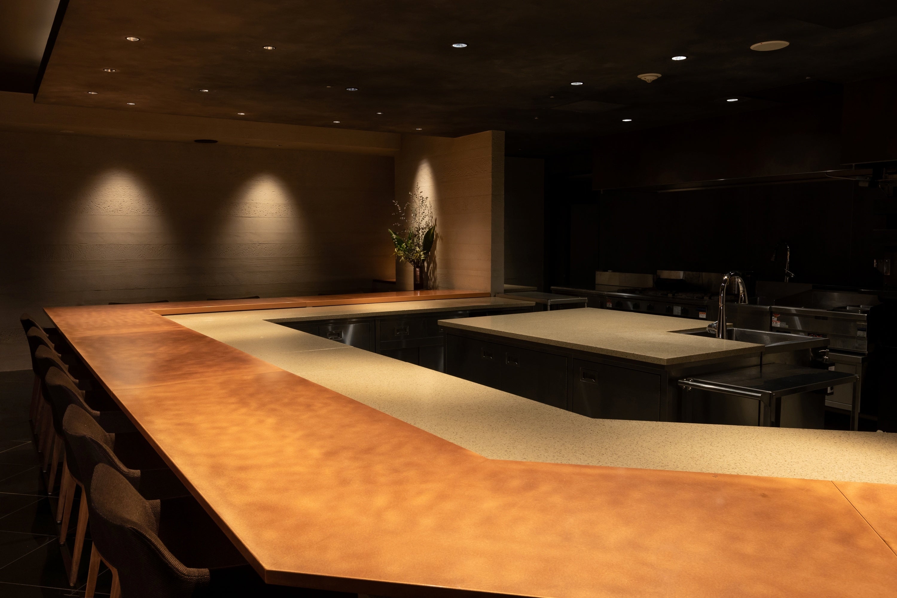 松戸駅から徒歩5分「KITEMITE MATSUDO」のB1Fにあるスーパーの奥を抜けたところに「懐食みちば」の秘密の入口があります。店内客席はカウンターが12席、テーブル席が8席(4名×2卓)の合計20席。カウンターなら目の前で料理人が調理しているところを見ながらお食事をしていただける特別な空間が広がります。