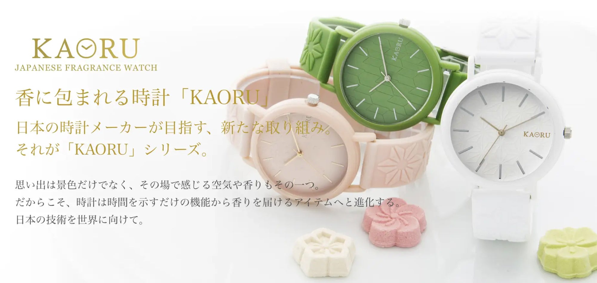 和の香りやスイーツの香りをテーマに、懐かしさや思い出の情景が蘇る、優しくふんわりと包み込むように香りがする腕時計です。