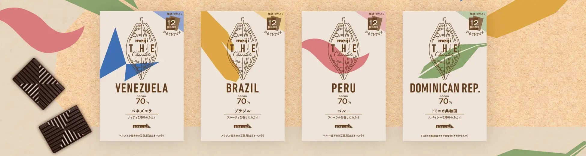 カカオ豆の産地によって異なる4つの香味を愉しめるチョコレートで、明治独自開発の発酵法や豆の選別、焙煎方法など、各産地のカカオ豆に合わせた製造工程にもこだわった商品です。ベネズエラ産はナッティ、ブラジル産はフルーティ、ペルー産はフローラル、ドミニカ共和国はスパイシーな香味が特徴です。2006年より始めたカカオ農家支援活動「メイジ・カカオ・サポート」と連動し、支援中の4カ国で生産された「明治サステナブルカカオ豆」を使用※しています。「明治 THE Chocolate」は、おいしいだけでなく、カカオに関わるすべての人を笑顔にする”サステナブル循環”を目指しています。個性豊かなカカオの香味を、「明治 THE Chocolate」で、ぜひお愉しみください。