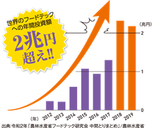 現在、食品生産~流通~店舗運営~消費に至るまでの食のバリューチェーン全体において、新たな技術やサービス導入が進められています。世界のフードテックへの投資額は年間2兆円を超えるようなビッグマーケットに拡大してまいりました。