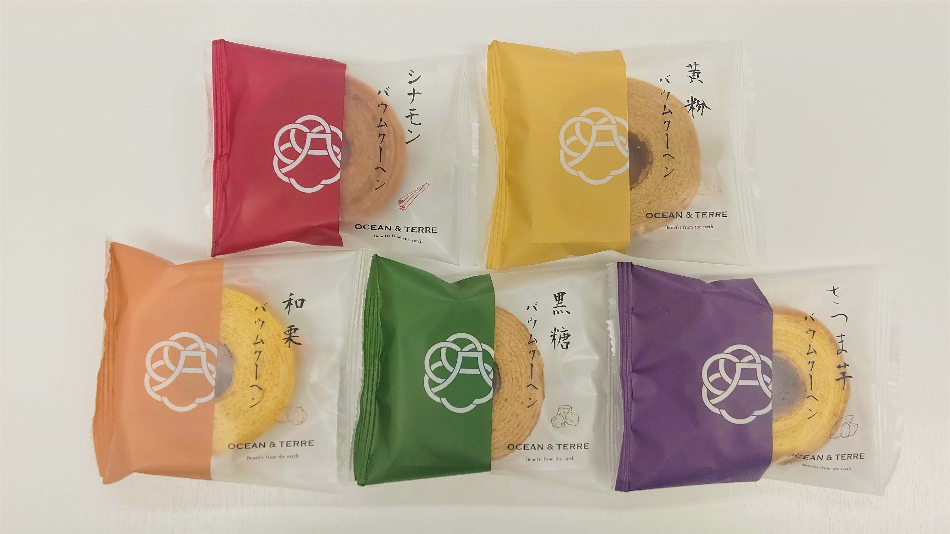 和を感じるバウムクーヘン。黄粉・黒糖・シナモン・さつま芋・和栗の5種類。黒蜜をかけるとより一層美味しくお召し上がりいただけます。