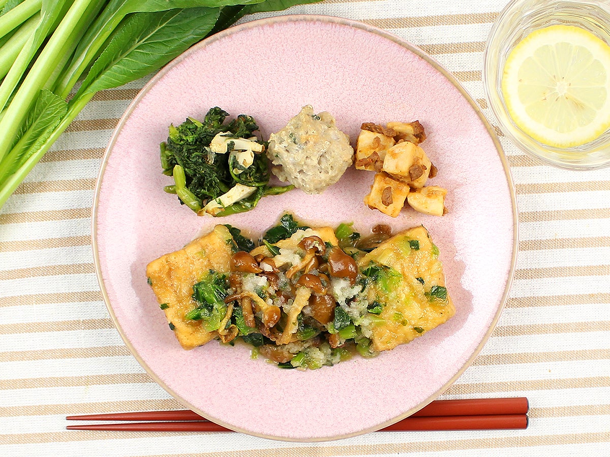 副菜は、春菊のおひたし、アジ入りつみれ、さといものそぼろ和えです。