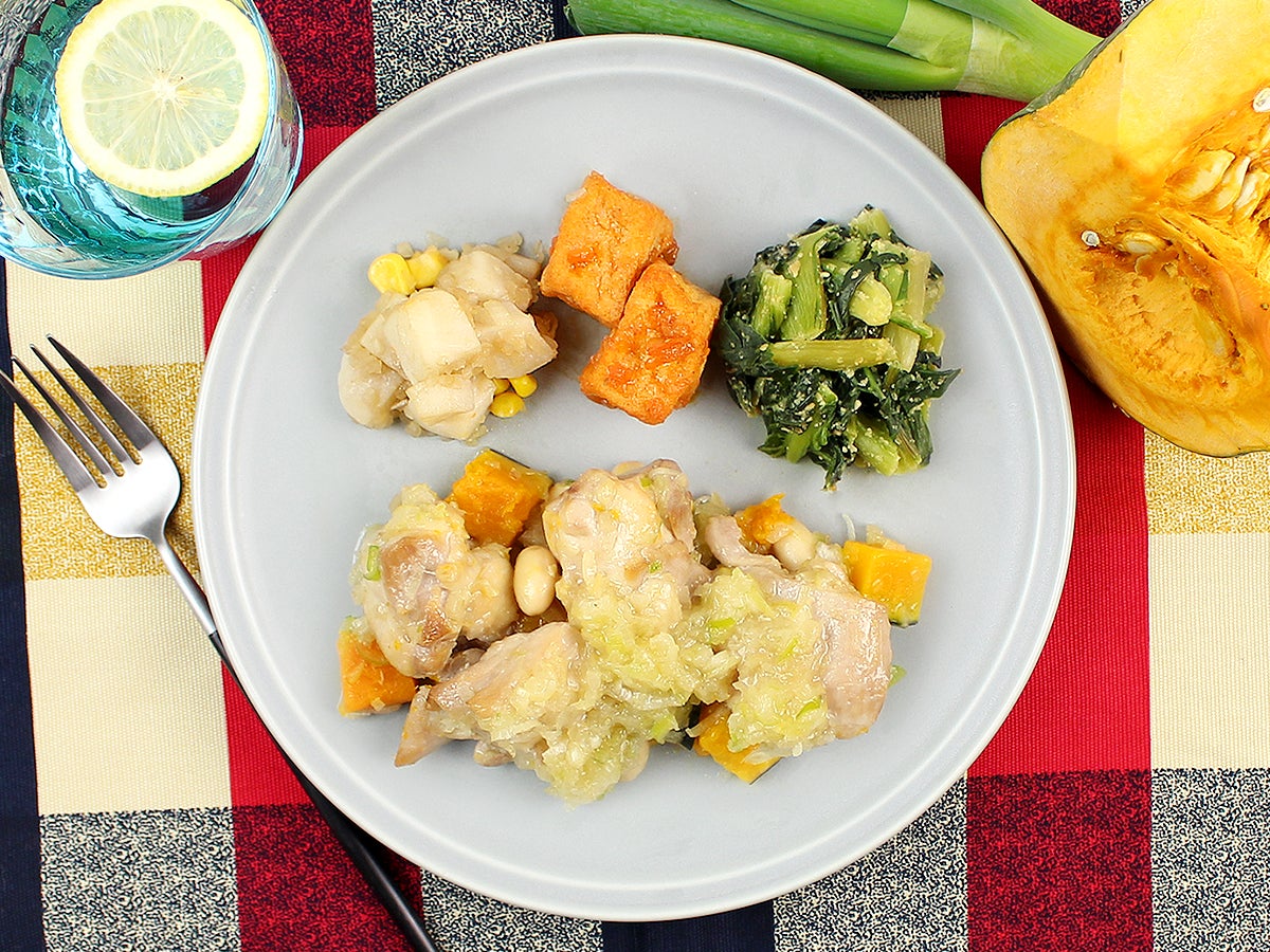 高温のスチームで柔らかく蒸しあげた鶏もも肉に、おろし生姜を効かせた葱たっぷりのソースをかけました。鶏肉の下には、鶏ガラスープで味付けしたかぼちゃと大豆を敷いておりますのでよく混ぜてお召し上がりください。