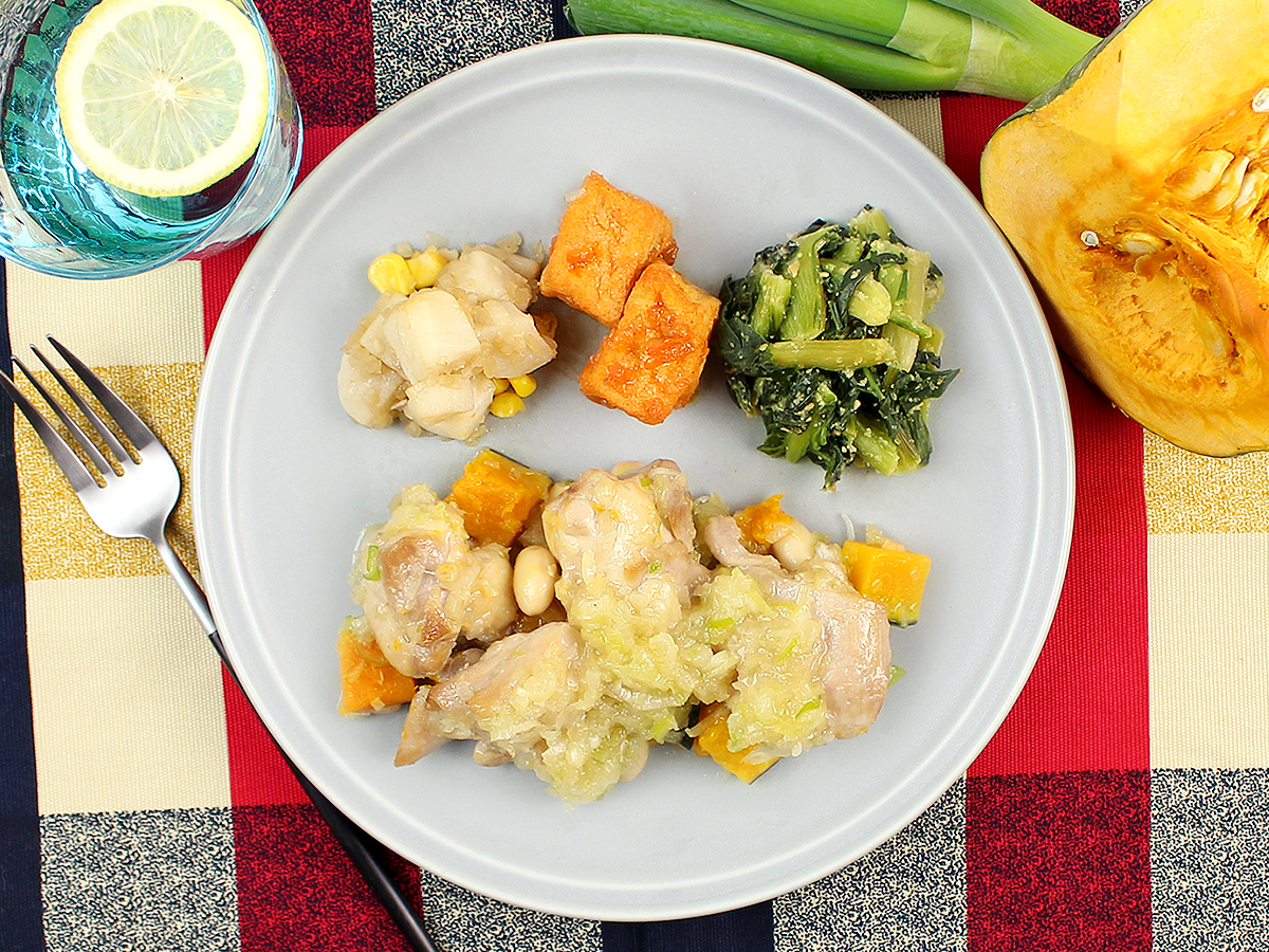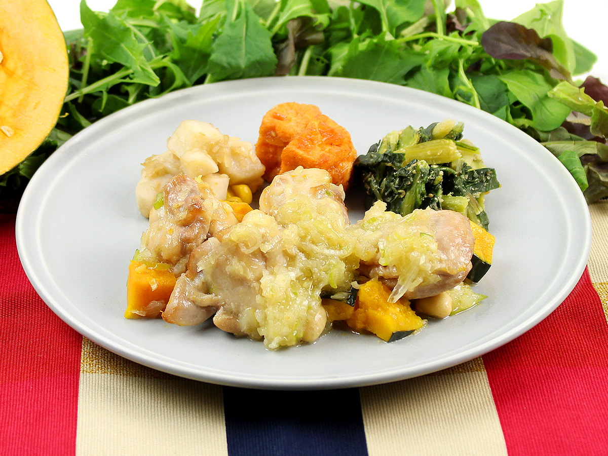 高温のスチームで柔らかく蒸しあげた鶏もも肉に、おろし生姜を効かせた葱たっぷりのソースをかけました。鶏肉の下には、鶏ガラスープで味付けしたかぼちゃと大豆を敷いておりますのでよく混ぜてお召し上がりください。