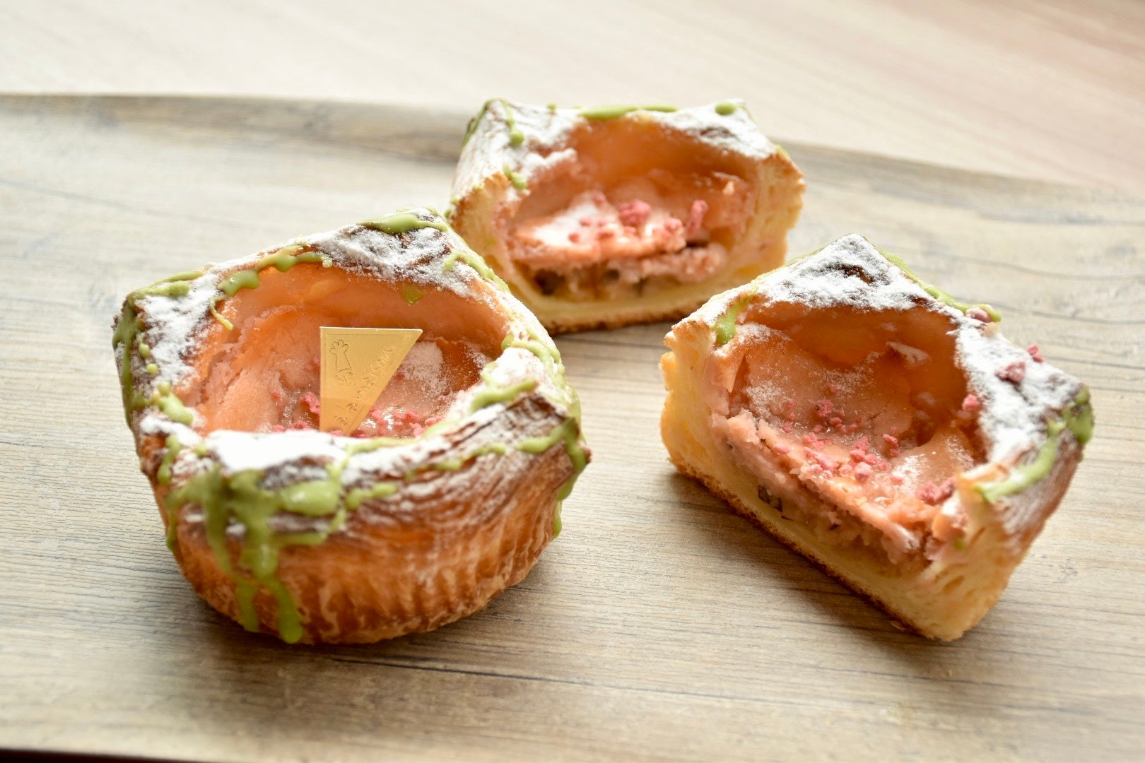 桜ペースト入りクリーム、アクセントに桜の葉を加えたアーモンドクリーム、桜ペーストを加えたクリームチーズが層になったデニッシュ。仕上げに抹茶のチョコレートと粉糖をあしらいました。パイ生地のサクサク食感とクリームの味の層が楽しい一品です。