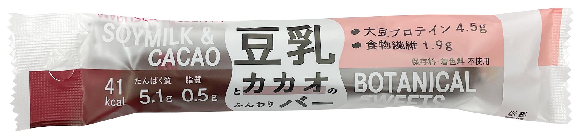 脂肪分の低いココアパウダーを使用し、滑らかでほんのりビターな風味の、ふんわり食感でやさしい甘さの豆乳バーです。