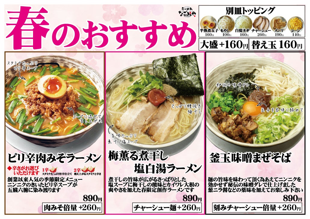 株式会社プレジャー(本社:愛知県尾張旭市、代表取締役:小山和紀)は、【ら~めんなごみや】にて春限定メニューを2023年3月4日より発売いたします。