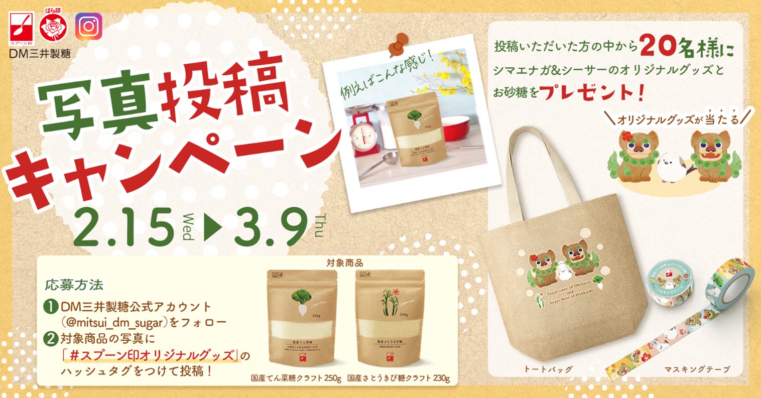 DM三井製糖公式Instagram(@mitsui_dm_sugar)にて、「国産てん菜糖クラフト」「国産さとうきび糖クラフト」の写った写真の投稿を募集するキャンペーンを実施します。投稿いただいた方の中から20名様に、クラフト2商品と「シマエナガ&シーサーオリジナルグッズ(トートバッグ、マスキングテープ)」のセットをプレゼントします。