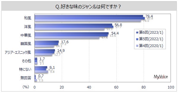 好きな味のジャンルは(複数回答)、「和風」が79.4%、「洋風」「中華風」が各50%台です。