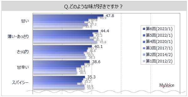 マイボイスコム株式会社(東京都千代田区、代表取締役社長:高井和久)は、6回目となる『味の好み』に関するインターネット調査を2023年1月1日~5日に実施しました。調査結果をお知らせします。