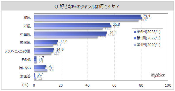 好きな味のジャンルは(複数回答)、「和風」が79.4%、「洋風」「中華風」が各50%台です。