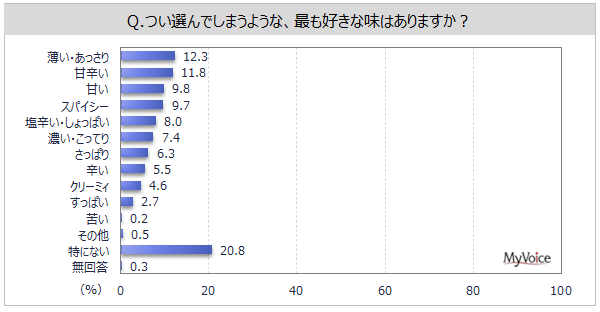 つい選んでしまう最も好きな味は、「薄い・あっさり」「甘辛い」が各1割強です。