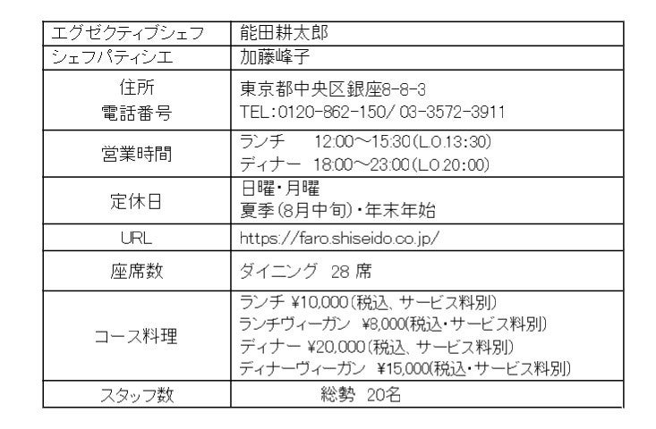 東京銀座資生堂ビル10階のファロでは、現代イタリア料理が備える伝統と先進性に、日本の豊かな食材や文化を重ね合わせたイタリアンの枠にとらわれないモダンでオリジナリティーあふれるクリエーション(料理)をご提供しています。銀座の地から世界に光を放つレストランを目指してファロ(灯台)の名の如く、新しい食文化を照らし出すのは、イタリア料理界の最前線を20年に渡り走り続け、イタリアで二つのレストランにミシュランの星をもたらしてきた唯一の日本人であるエグゼクティブシェフの能田耕太郎です。ファロが特に力を入れているのは、能田が“制限ではなく、新しい表現。日本の精進料理にも通じる。”と語るヴィーガンコース。ヴィーガンの方だけではなく、“美味しく食べて、体の中から美しく”を求める多くの方々に是非ご体感いただきたいコースメニューです。同時に、ヴィーガンというライフスタイルにサステナビリティや平和の可能性を感じており、環境や動物に負担をかけない食生活を通して、“心豊かに楽しく暮らしながら、地球や社会の美しさも守る”取り組みを追求しています。