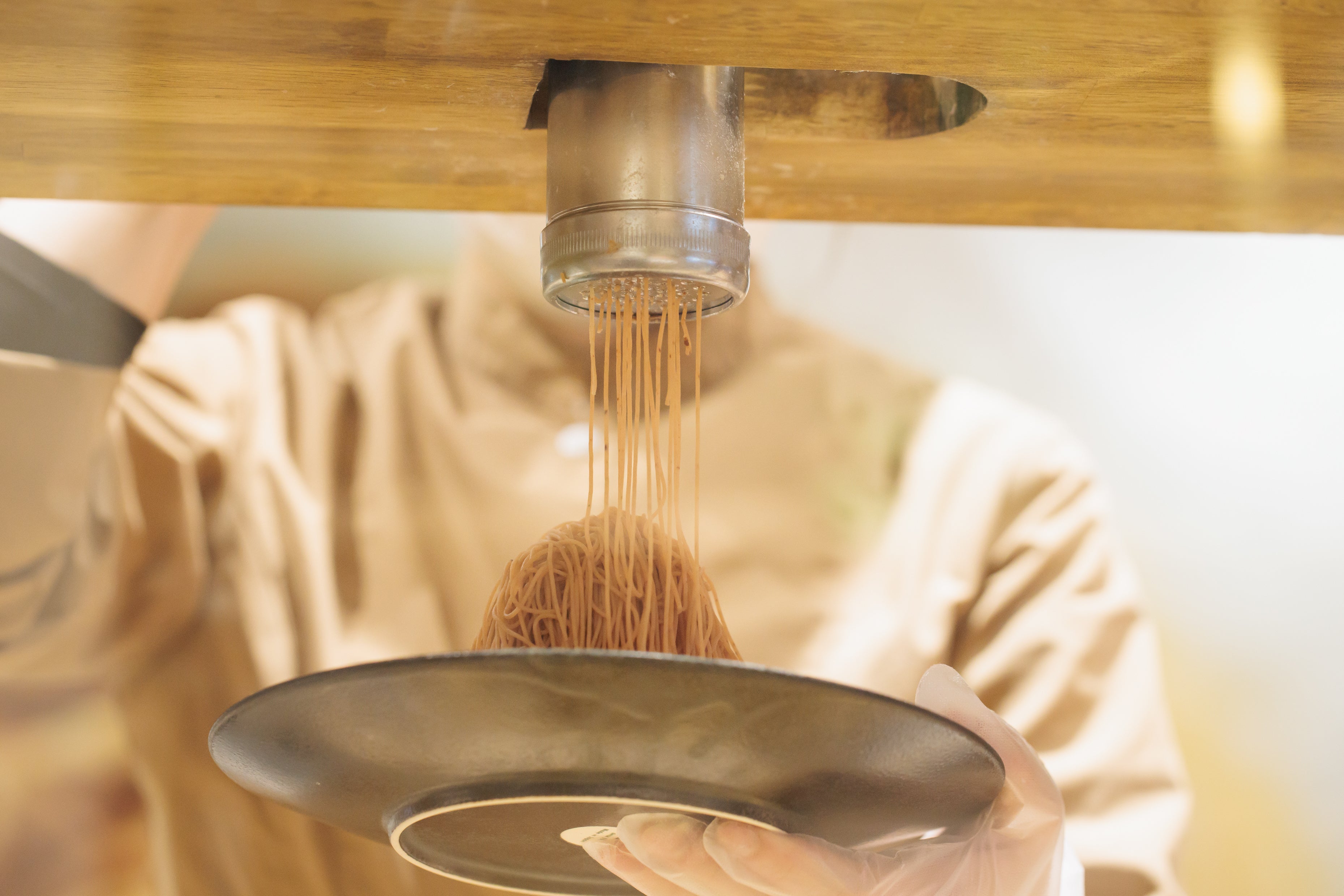 モンブランには、栗の一大産地であるイタリアの力強い風味が特徴の伊栗と、ほっくりとした食感とやさしい甘みを持ち「栗の王様」とも言われる熊本県産の利平栗を使用します。それらを独自の配合でブレンドし、マロンクリームを作り、独自に開発したモンブラン専用搾り機で直径1mmの細さに搾ります。そうすることで、空気を含み、ふんわりとほどけるような口どけを生み出します。