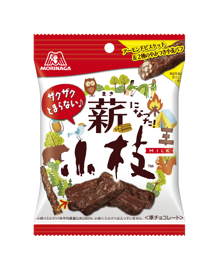 「薪小枝」は、アーモンドビスケットと2種類の大・中ミックスサイズの小麦パフのザクザク食感と、通常の「小枝」重量比約280%のボリュームたっぷりの食べ応えが特長の、「小枝」ブランドの新シリーズです。「小枝」らしさはありながらも、食感とボリュームが特長の新シリーズで、若年層の需要開拓を目指します。