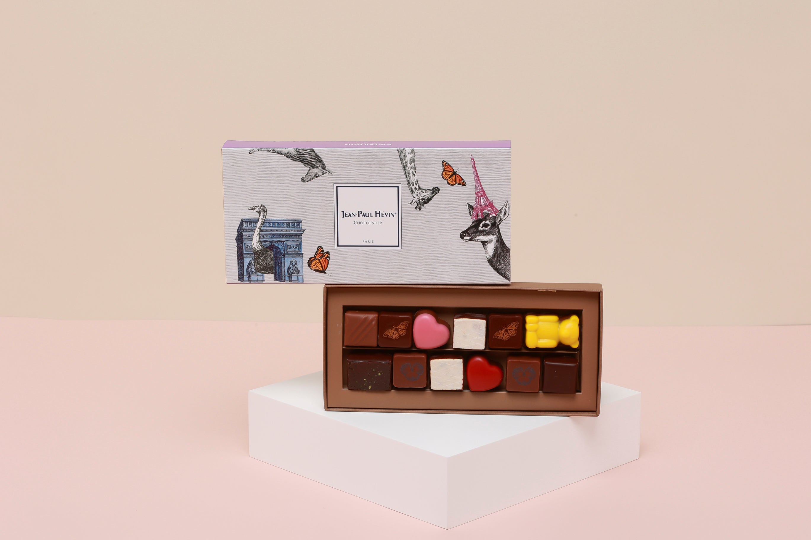 ジャン=ポール・エヴァンのブティックで働くスタッフをイメージしたテディベアと、期間限定のボンボンショコラ「パピヨン」、「パンセ」、「JPH ヌガー ノワール」を含むボンボンショコラ9個の詰合せ。この時期だけの特別なBOXです。