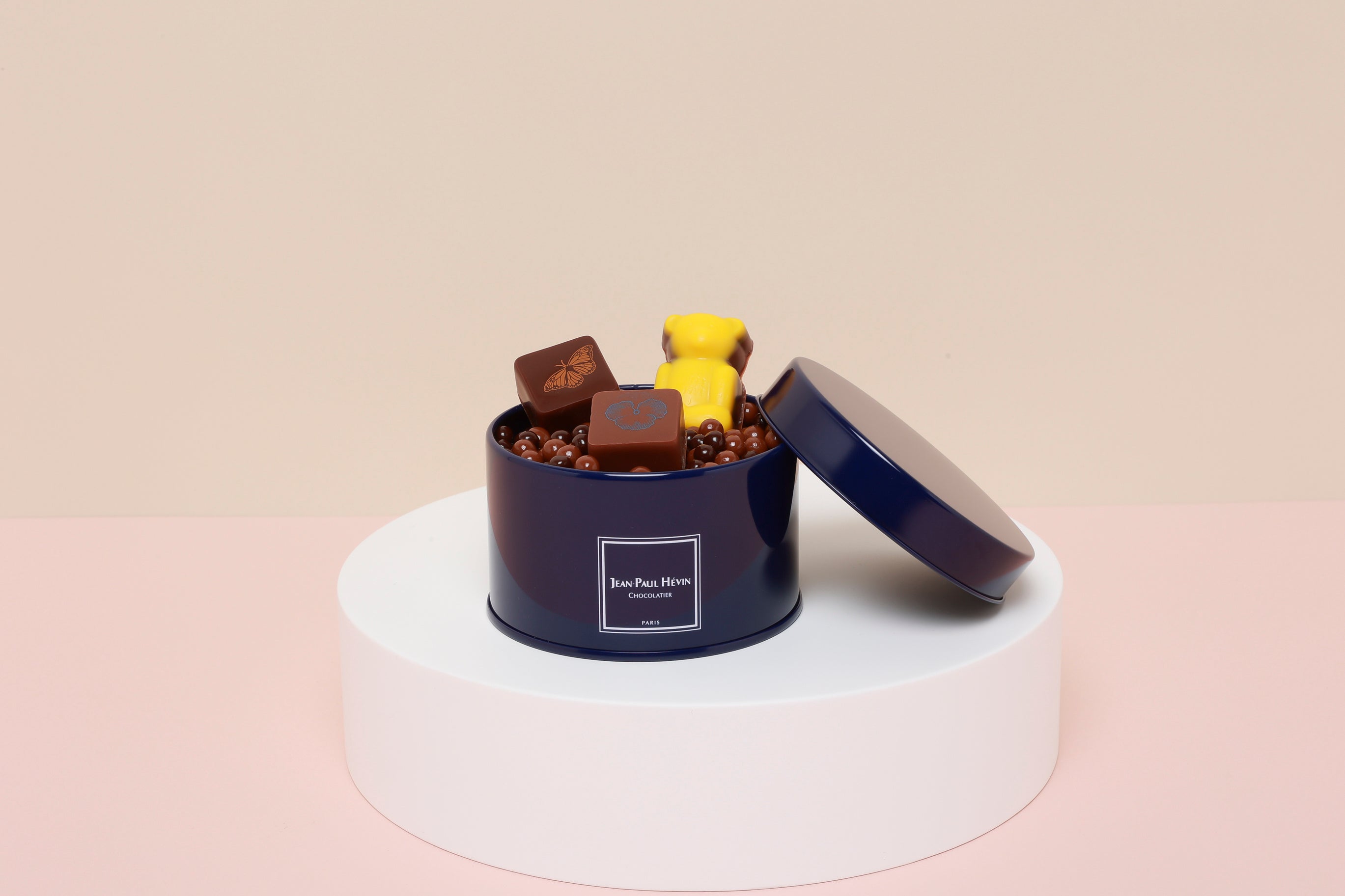 期間限定のショコラ3個と、シリアルをチョコレートでコーティングした「ペルル クラッカントゥ」をブルーの缶に詰合せ。