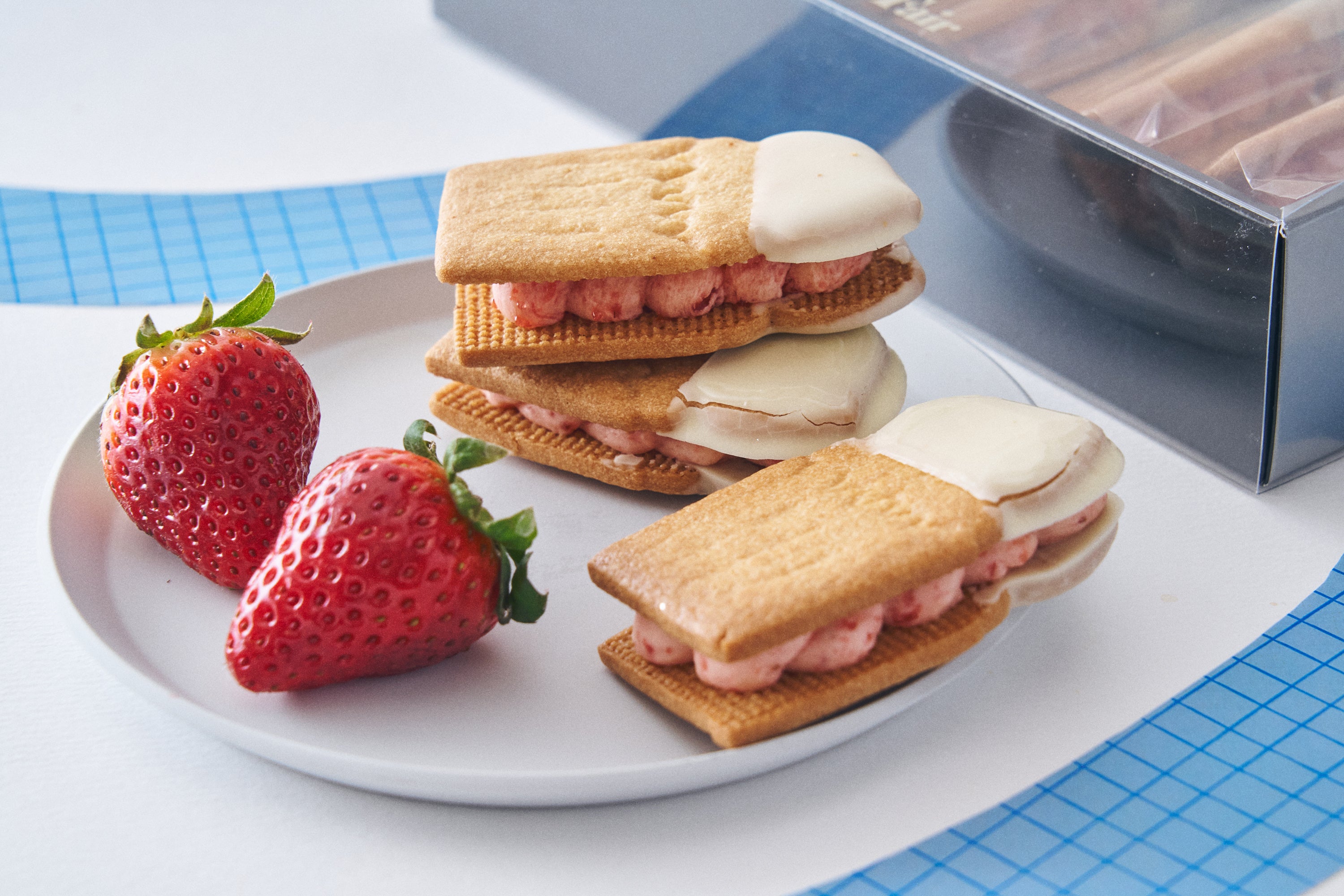 奈良県明日香村より産地直送で届く「古都華」の自家製いちごジャムをたっぷりと贅沢に混ぜ込んだいちご生バタークリームを香ばしいビスケットでサンドした春季限定の新商品です。