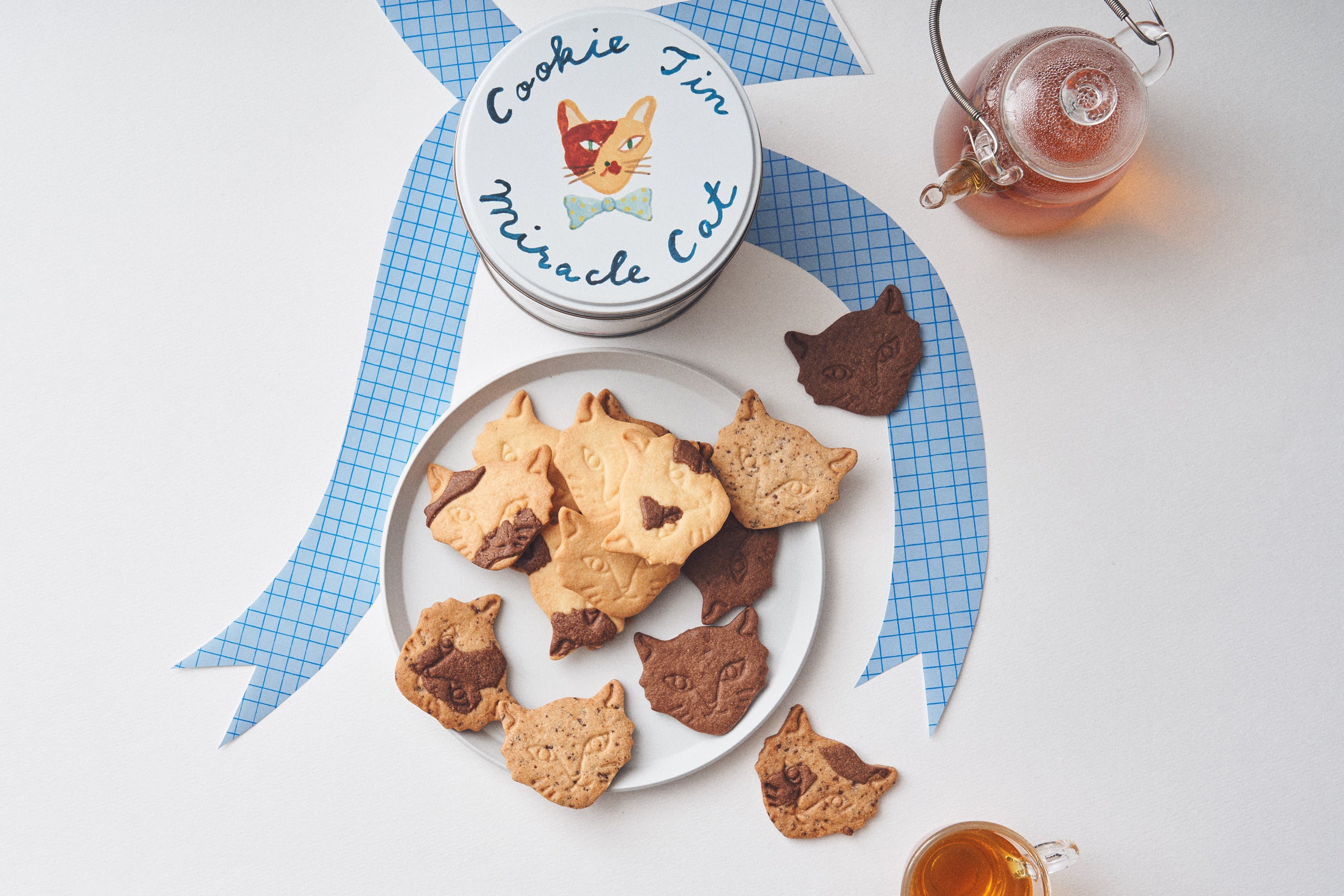 一匹ずつ模様が違う猫たちが可愛い缶にぎっしり。猫好きにはたまらないこちらのクッキー缶は、ミュージシャンの坂本美雨さんとイラストレーターの前田ひさえさんとのコラボレーションで作ったひと缶。珍しい柄や不思議な模様をもつ「神様のいたずら」と呼ばれる猫たちをモチーフに、発酵バターやカカオ、チョコチップを使って焼き上げたクッキーが入っています。「Miracle cat cookie Tin」は収益の一部を動物保護団体へ寄付いたします。