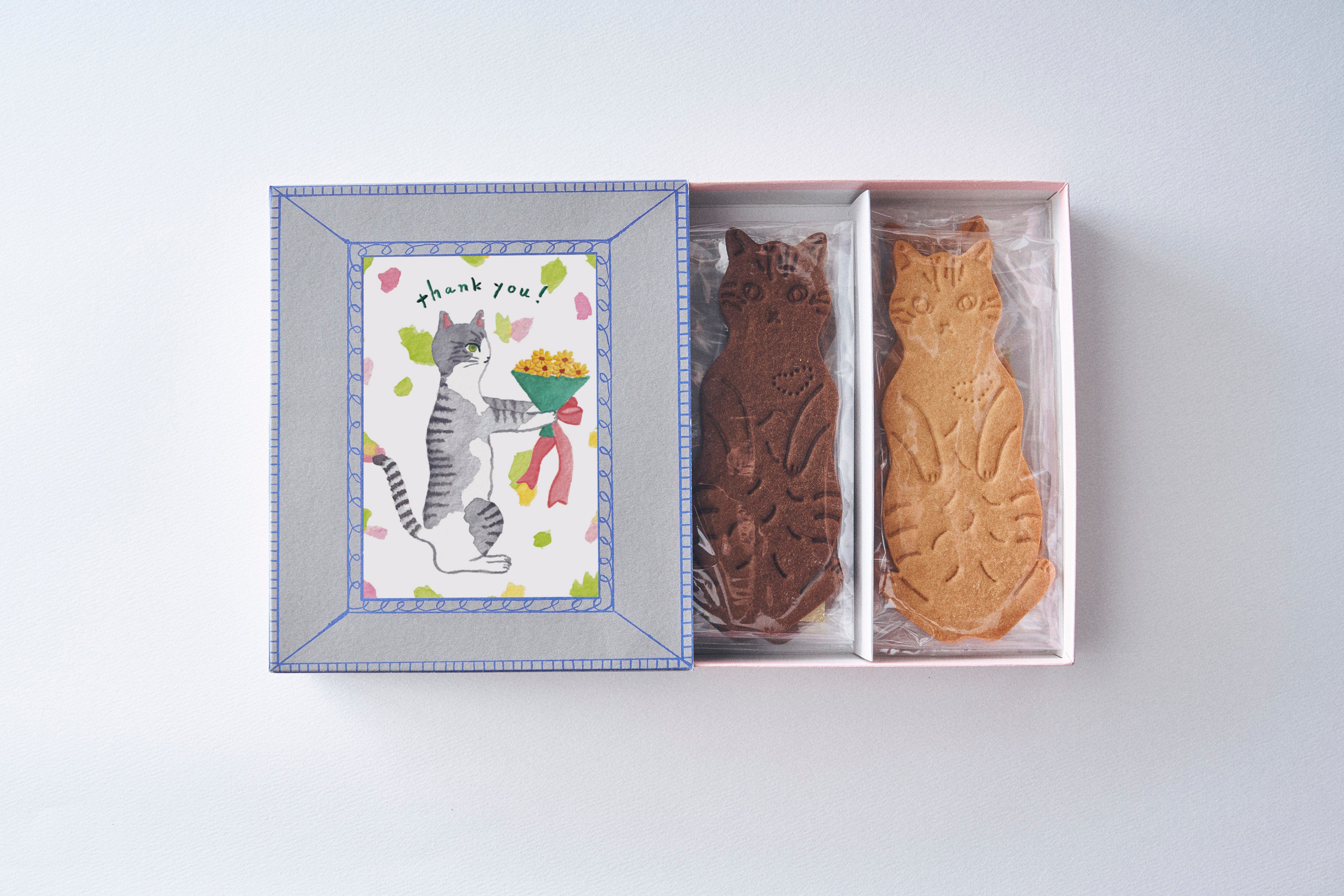 ミュージシャン坂本美雨さんとイラストレーター前田ひさえさんと一緒につくった、リユース可能なパッケージにポストカードとダイナミックな大判ネコクッキーが入ったネコスイーツギフト。坂本さんの愛猫、サバ美の“#ズサァ”をモチーフにした大胆なサイズ感のネコクッキーは、塩バターとカカオの2種類の発酵バタークッキーを詰め合わせました。心地よいさっくりとした食感と素朴な味わいで、子ども大人も食べ応え充分なクッキーです。