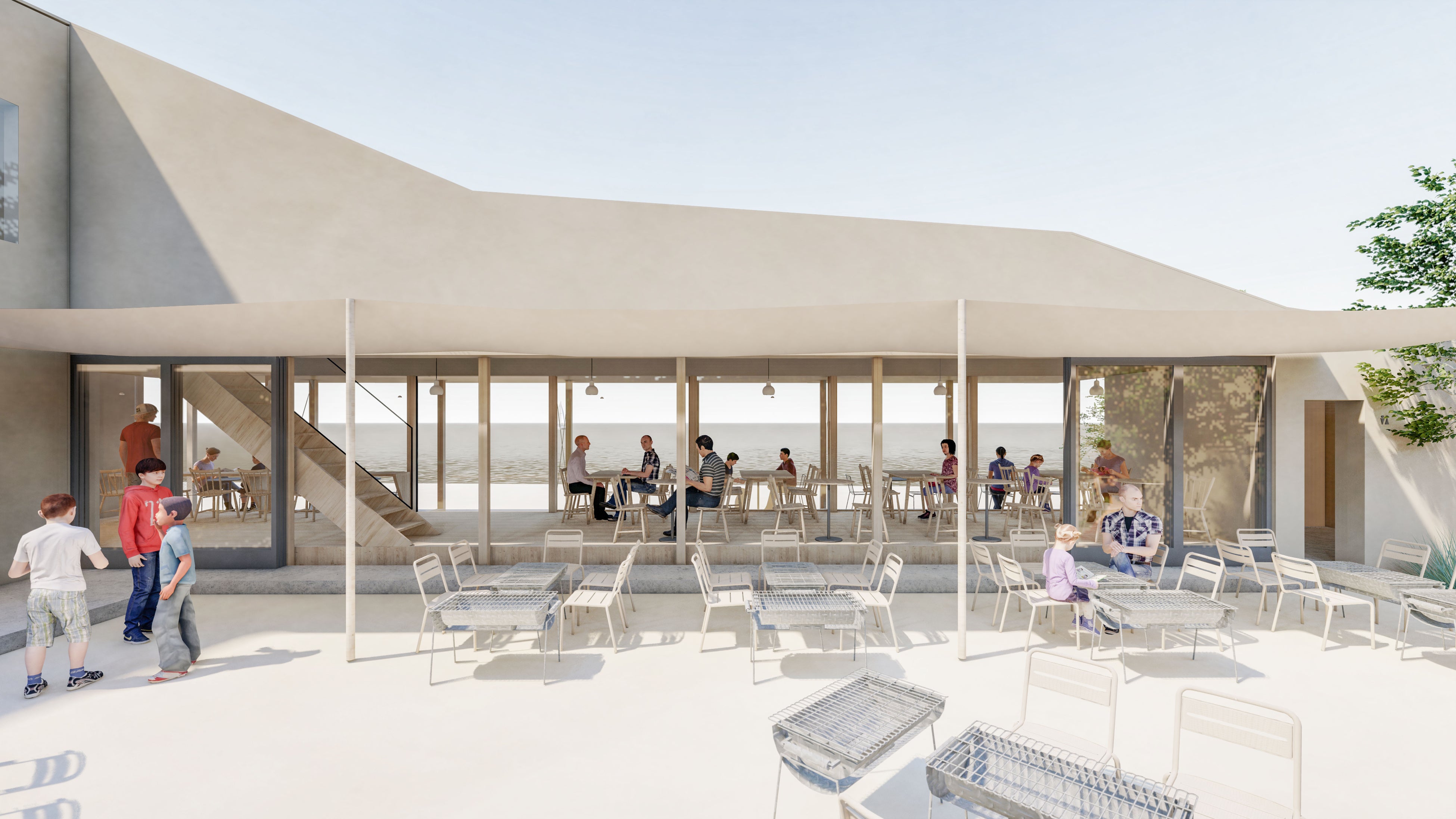 当施設の敷地は美しい景色を眺められる一方、季節によって海から吹く強風で屋外活動が制限される場所です。建物の特徴的な細長いフォルムは、広い敷地を強風から守りつつ、人々が集まる広場としてデザインしています。