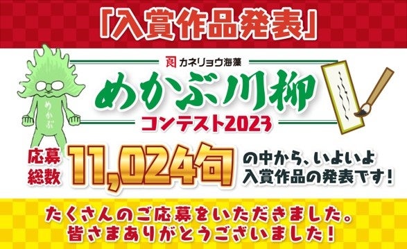 海藻の総合メーカーであるカネリョウ海藻株式会社(代表取締役社長:髙木良樹 所在地:熊本県宇土市笹原町1544)では、第2回目となる『めかぶ川柳コンテスト2023』を開催。応募総数11,024句の応募(作品数)が寄せられました。そしてこの度、厳選なる審査によって、ついに受賞作品が決定しました。全国の皆さまからの沢山のご応募、誠にありがとうございました。