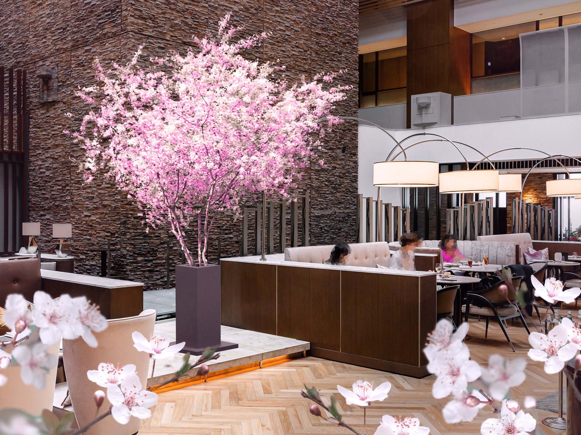 | お花見しながらアフタヌーンティー! プロジェクションマッピングによる桜アートツリーが出現 3月15日(水)~5月9日(火)の期間中、レストラン内にはプロジェクションマッピングによる満開の桜アートが設置されます。ゆらめく桜を眺めながら、優雅に過ごすひとときを。 |