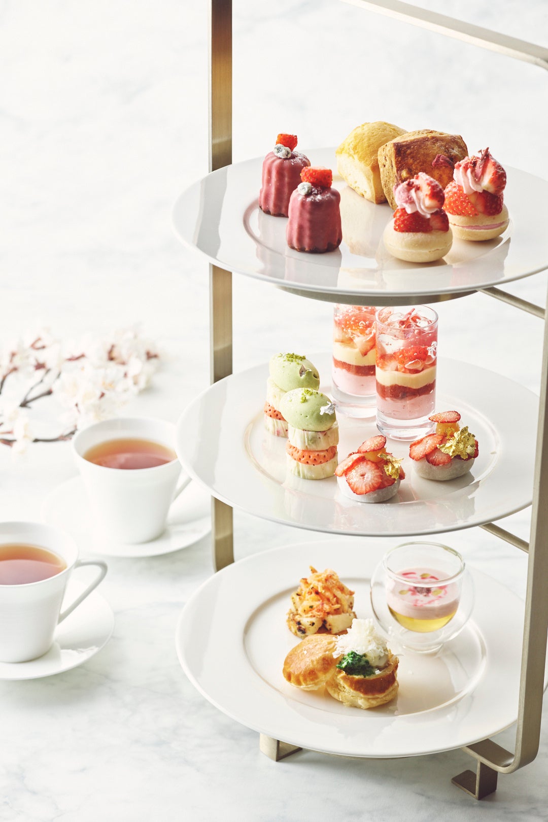 春の訪れを感じる、桜×いちごの最強コンビネーションをぎゅっと凝縮!キュートなビジュアルとは裏腹に、すっきりとした甘さのお米のババロアに日本酒のゼリーや桜を合わせた大人な味わいのパフェ、求肥に包まれた粒あんにスライスいちごをトッピングしたいちご大福、桜リキュールとコンソメゼリーの桜ヴィシソワーズなど、スイーツもセイボリーも春爛漫!淡く儚い桜ピンク、エモーショナルないちごの紅色、春に一斉に芽吹く草木のようなやわらかなグリーンと、見た目にも春の息吹を感じるココロ浮き立つアフタヌーンティーです。