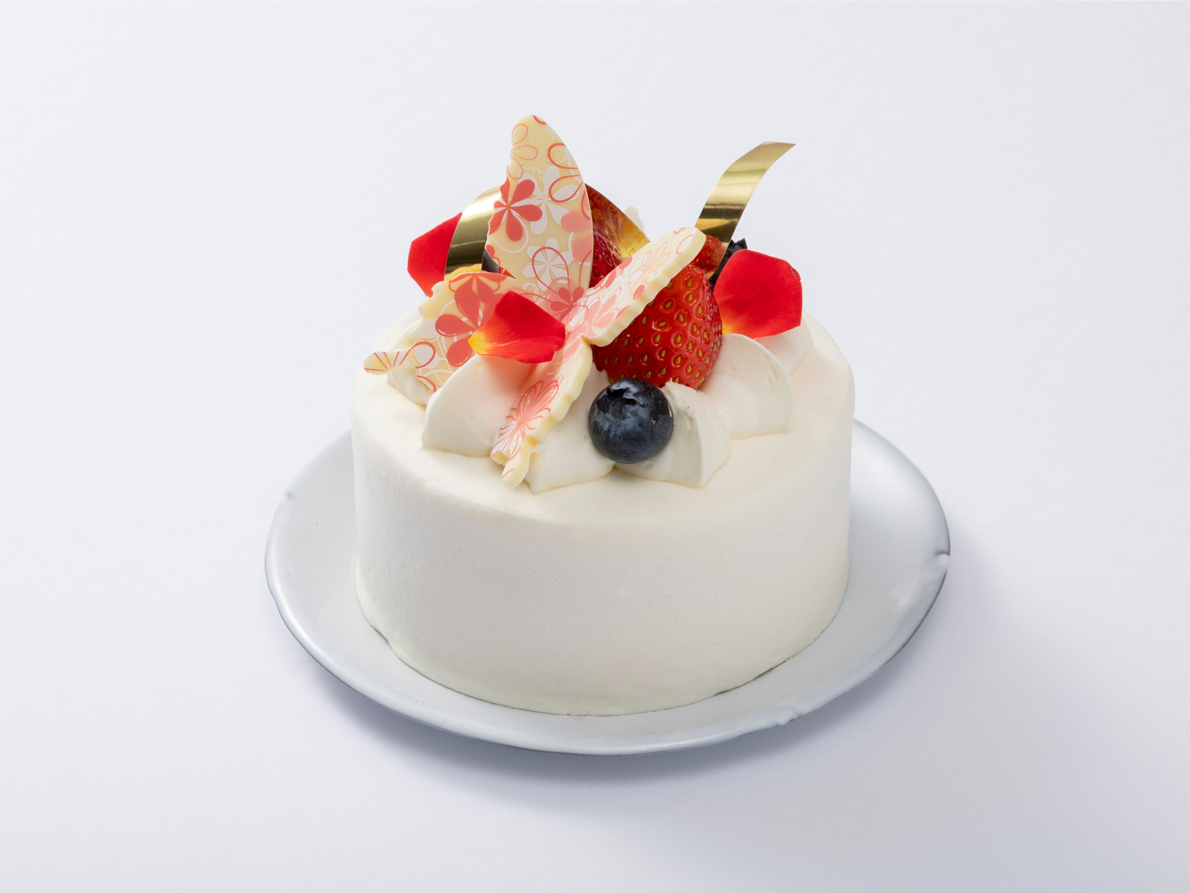 バラの花びらとホワイトチョコレートの蝶をあしらった、ホワイトデー限定アントルメ。ライム風味のヴァニラシロップに浸したジェノワーズがアクセント。