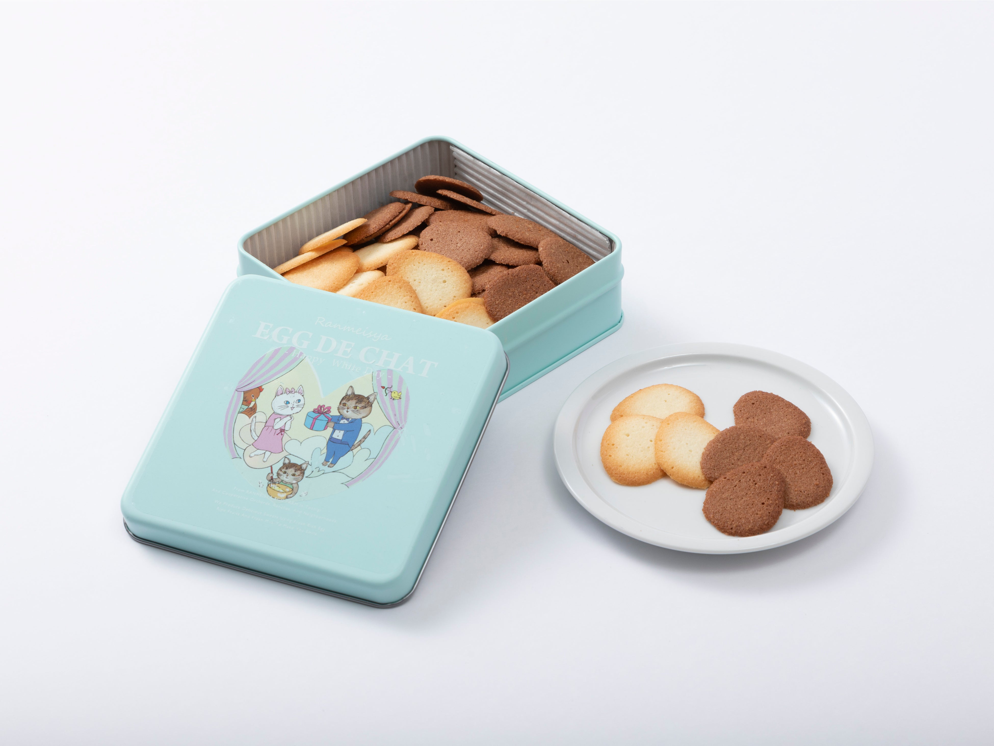 小さな卵型のクッキーに優しさと美味しさを込めて、ホワイトデーをモチーフにしたデザインが描かれた缶の中にはプレーンとショコラの味わいのエッグドシャを詰め込みました。