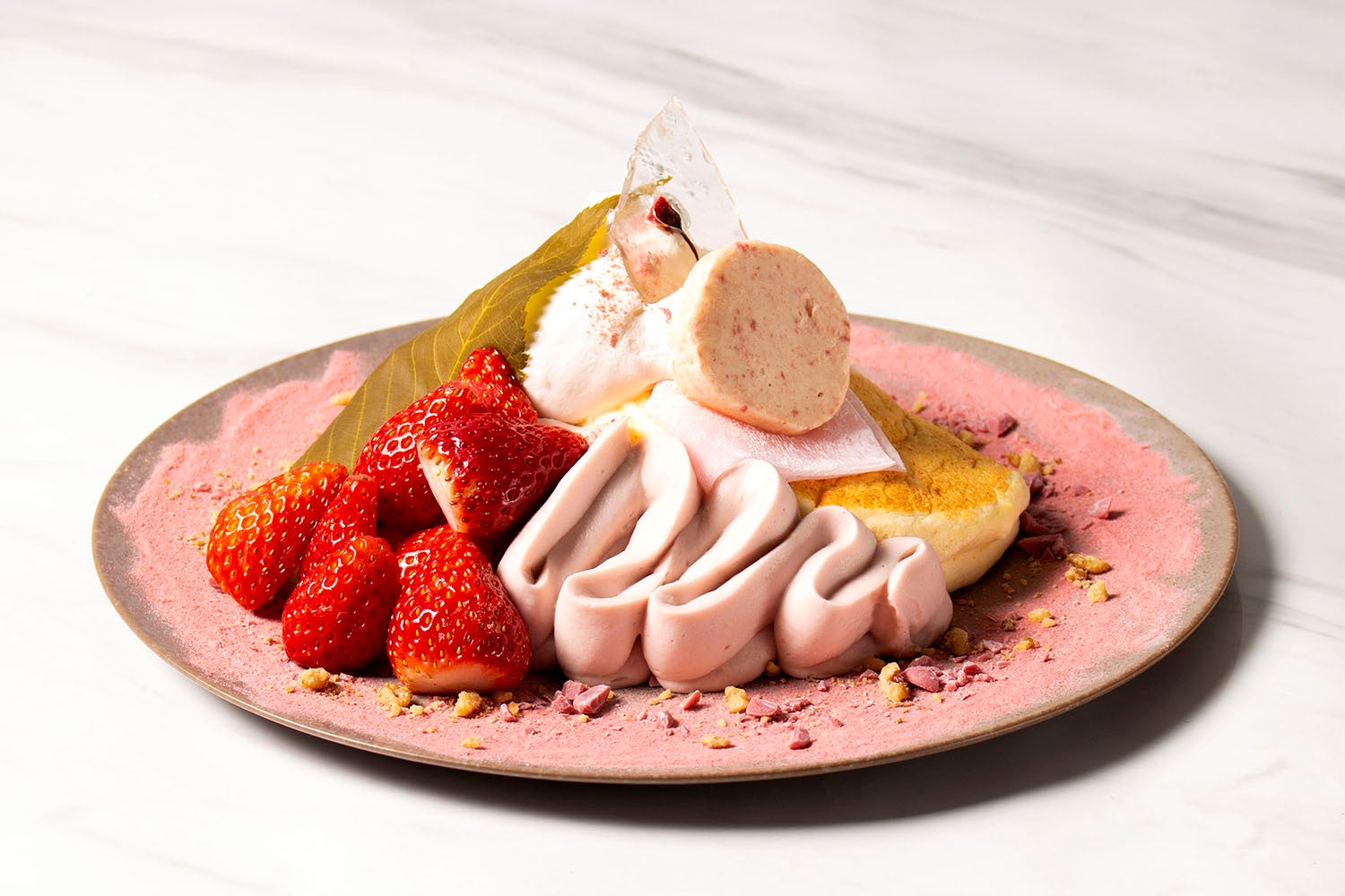 甘酸っぱい“あまおう”×甘塩っぽい“桜”をベースに、求肥とパンケーキのモチふわ食感が楽しめる春を代表する桜といちごのパンケーキです。