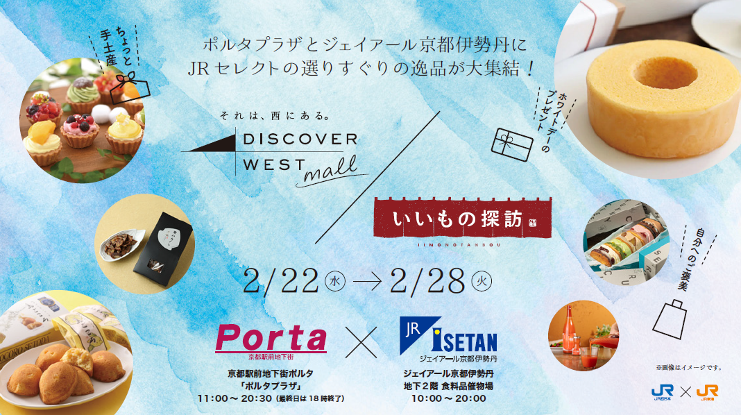 JR西日本では、西日本地域の皆様と磨き上げた「地域の逸品」の販売等を通じ地域の活性化に貢献すべく、公式オンラインショップ「DISCOVER WEST mall(ディスカバーウエストモール)」(以下DWmallと表記)を運営しており、来る3月1日でオープン1周年を迎えます。それにあわせ、JR東海が運営するオンラインショップ「いいもの探訪」とコラボし、実際に商品を手に取ってご購入いただけるリアルイベントを、西日本エリアで初めて開催いたします。JR西日本・JR東海の両エリアから集まった15事業者が、京都駅前地下街ポルタとジェイアール京都伊勢丹を舞台に、人気のスイーツやお惣菜、お酒など、各地の選りすぐりの品を販売します。是非お誘いあわせのうえ、お出かけください!