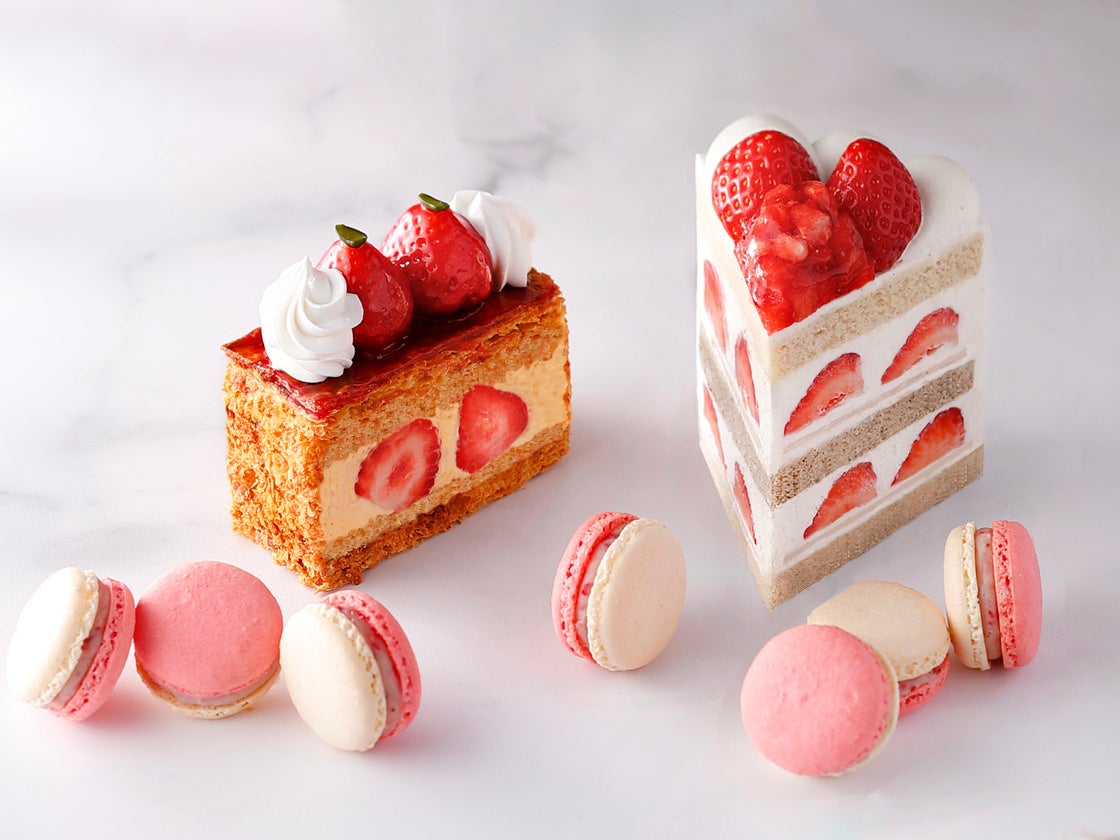 厳選した福岡県産「博多あまおう」を1ピースあたり8粒使用した”究極のショートケーキ”『新エクストラスーパーあまおうショートケーキ』や、ホテル特製カスタードをたっぷりと「博多あまおう」とサンドした『あまおうナポレオンパイ』など、イートインでもテイクアウトでもお愉しみいただけるあまおうスイーツ8種類が勢揃い。豆乳のホワイトガナッシュに「博多あまおう」のフリーズドライが入った『あまおうマカロン』は、見た目も可愛らしい、お手土産にもおすすめスイーツです。