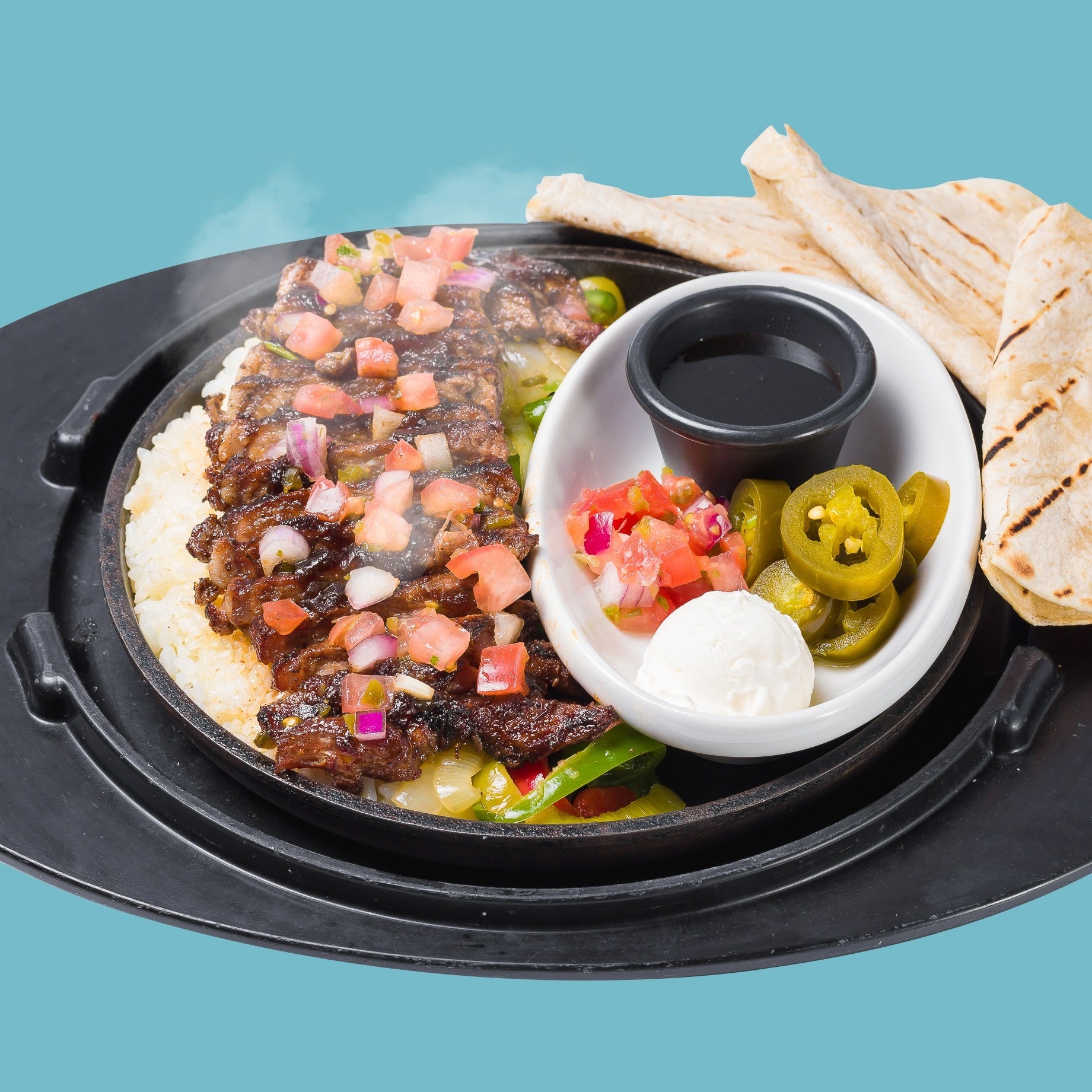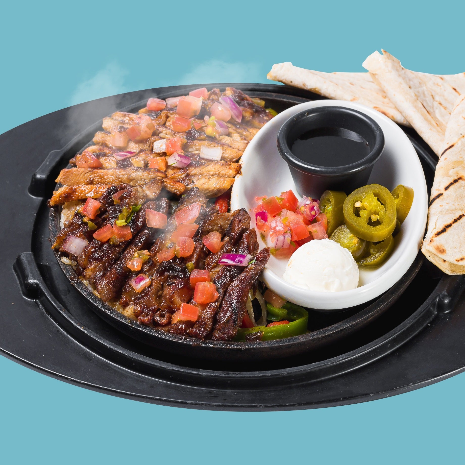 ケイジャンスパイスでシーズニングした、サーロインステーキとグリルチキン1枚を甘くてコクのある特製のフライデーズシネチャーソースで絡めたボリューミーなコンボプレート。アツアツの鉄板にバターライス、ペッパーオニオンに盛り付け、ピコデガヨで彩り豊かに仕上げました。サワークリーム、ピコデガヨ、スライスハラペーニョをお好みでトッピングして、グリルしたトルティアに具材と一緒に巻いてお召し上がり下さい。
