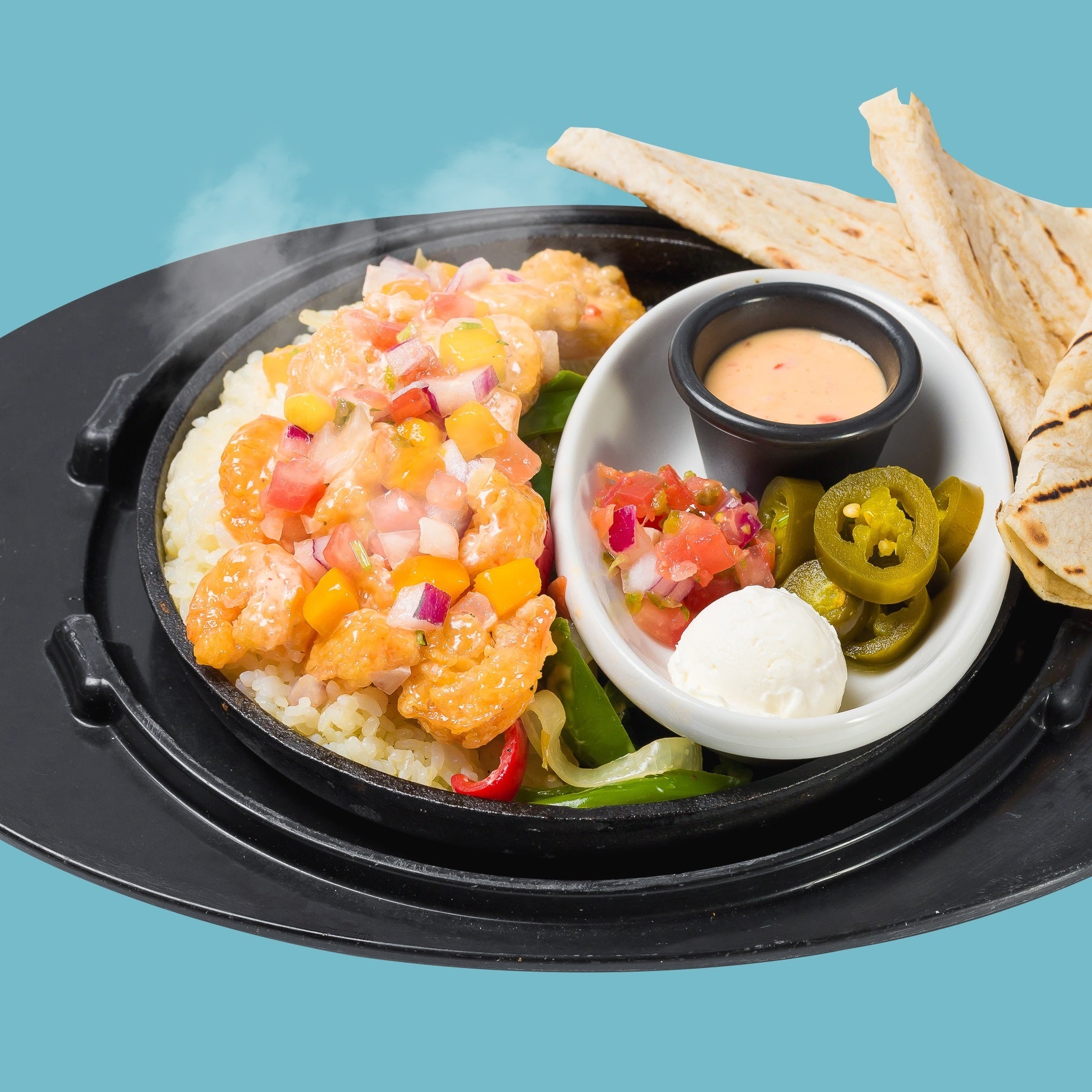 ゴールデンブラウンに揚げた12尾のシュリンプをスイートチリ、マヨネーズにシラチャソースを加えた特製のブンブンソースで和え、アツアツの鉄板にバターライス、ペッパーオニオンに盛り付け、マンゴーピコデガヨで甘酸っぱい南国テイストに仕上げました。サワークリーム、ピコデガヨ、スライスハラペーニョをお好みでトッピングして、グリルしたトルティアに具材と一緒に巻いてお召し上がり下さい。