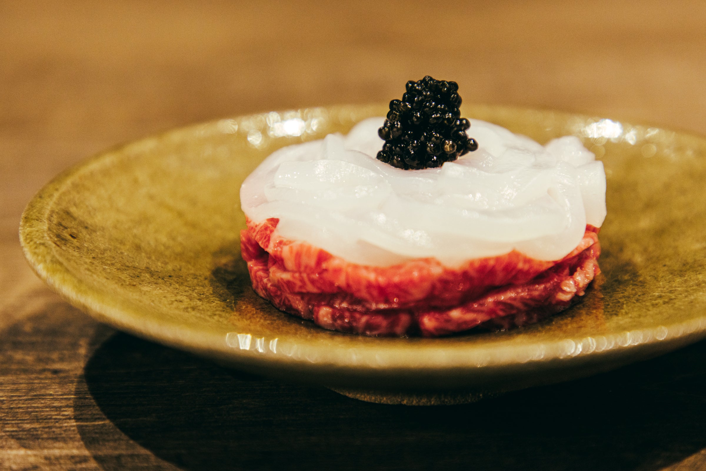 和牛の赤身を清涼感のあるタルタルに仕上げました。ねっとりとした甘み溢れる“アオリイカ”とキャビアの塩みが口どけの良い赤身肉の濃厚な旨みをさらに引き立てます。