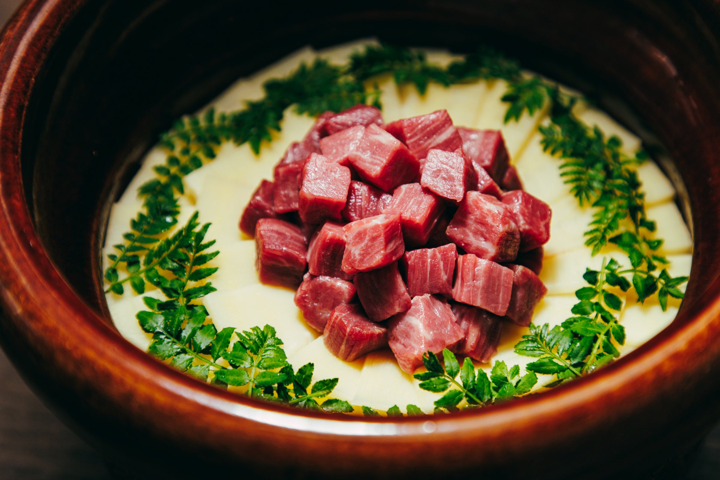 清涼感あふれる“セリ”の風味と厳選部位の甘みを天日に鍛えられたお米がしっかりと受けとめる土鍋ご飯です。余熱だけでレアに仕上げた、とろける食感の和牛と“セリ”の香気をお楽しみください。