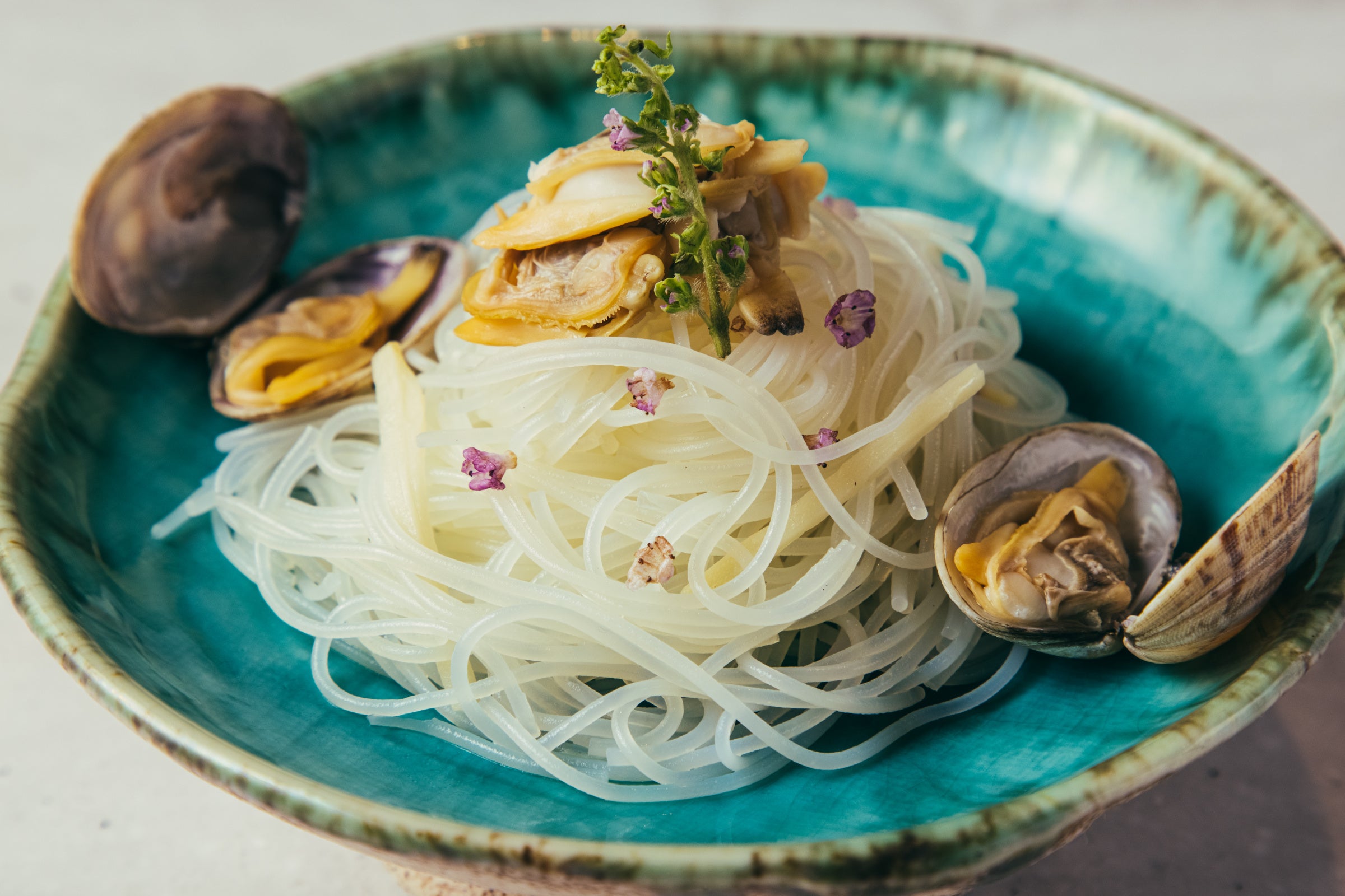 じっくりと殻ごと煮出したあさり出汁とむき身を、風味豊かな旬の筍にビーフンを加えて仕上げました。濃厚な旨みが詰まったあさり出汁ビーフンと甘みのある筍の歯ごたえが小気味よい春の前菜です。