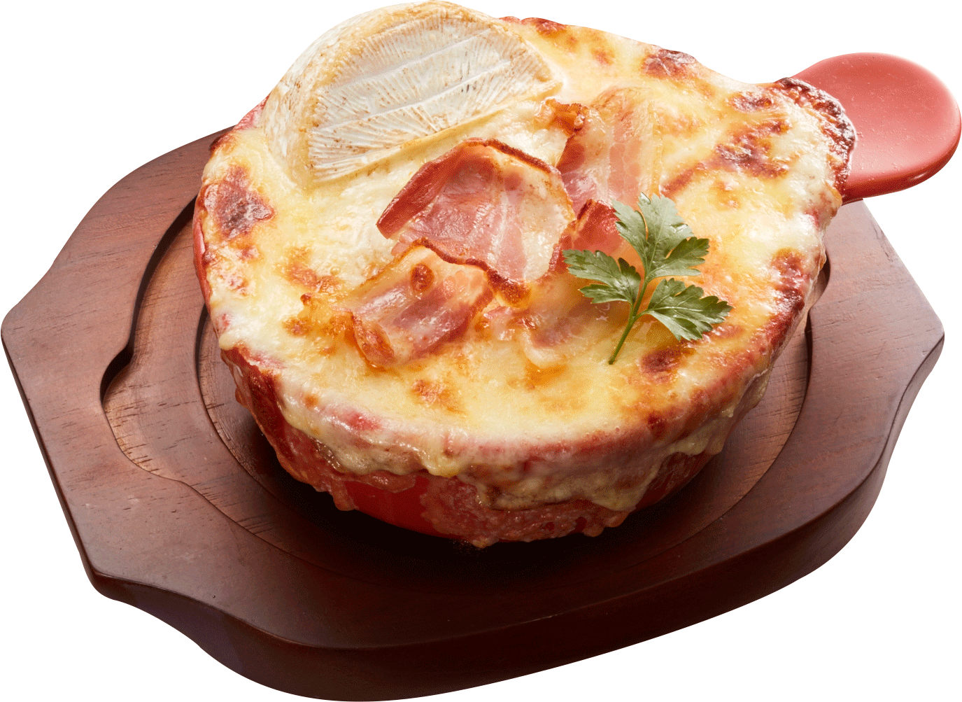 ハーフサイズのカマンベールチーズをのせてオーブンで焼き上げた、チーズ好きにはたまらない“窯焼きチーズパスタ”です。とろ~りとろけるカマンベールチーズと、こんがり焼けたベーコンが、トマトクリームソースのパスタとベストマッチ。お好みで、フライドガーリックやブラックペッパーをかけてお召し上がりください。