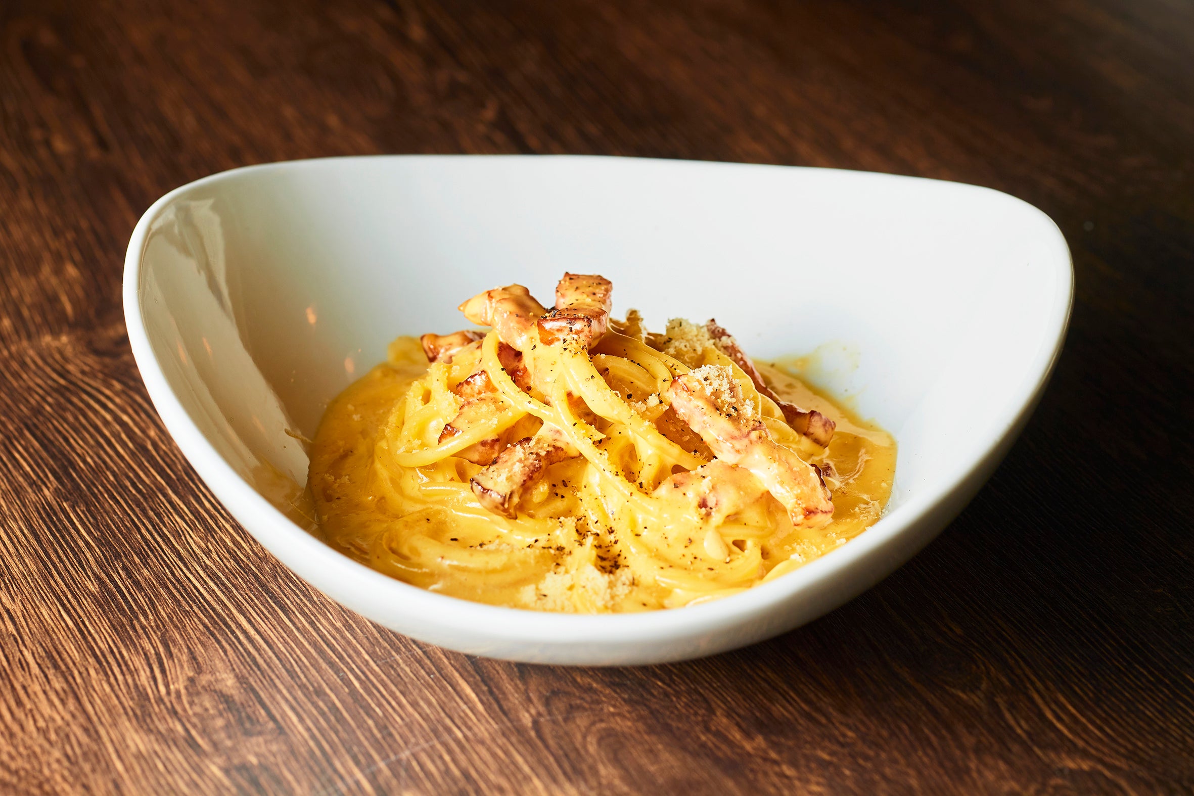 燻製のおつまみカルボナーラ 690円(税抜)/濃厚さとスモーキーさがたまらない。自慢の逸品です。