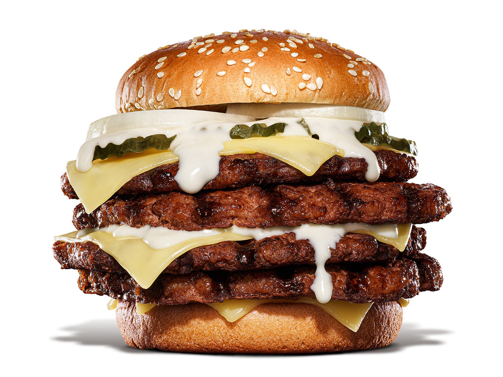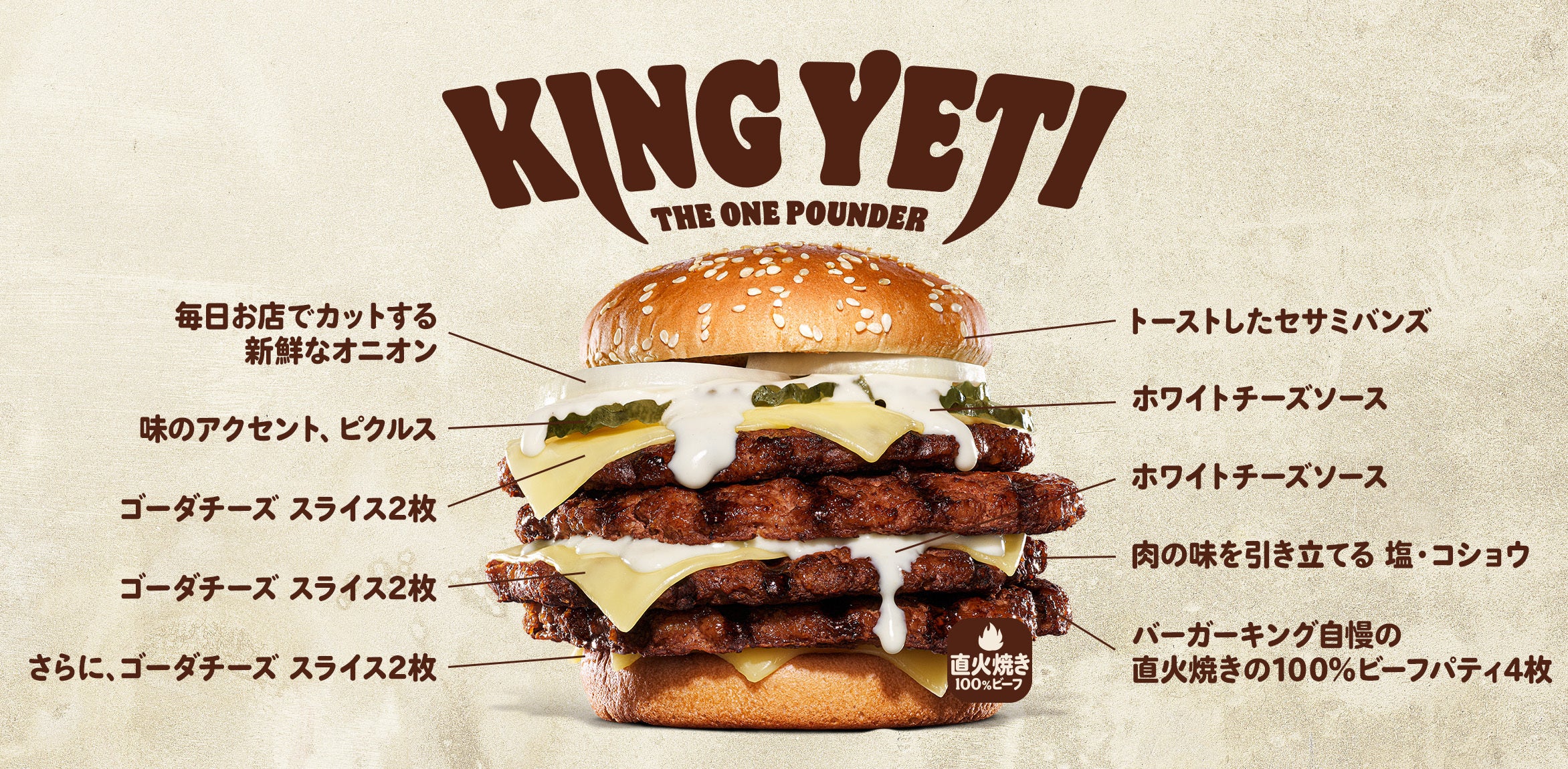バーガーキング® から、2023年1月に発売し好評いただいている、チーズバーガー界を見おろすデカさの「チーズバーガー・ゲレンデ」シリーズの締めくくりとして、直火焼きの100%ビーフパティ4枚とゴーダチーズスライス6枚をホワイトチーズソースで仕上げた、超大型チーズバーガー『キング・イエティ ザ・ワンパウンダー』が登場いたします。