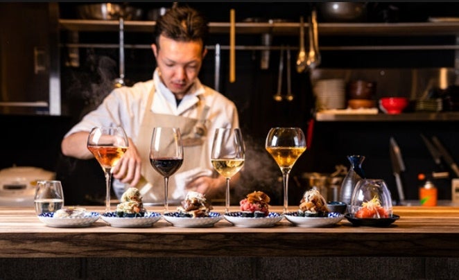 新業態となる『焼き鳥とワイン+あて寿司 3B 飯田橋』では、既存店である『焼き鳥とワイン+ビストロおでん 3B 神保町』の“焼き鳥とワイン”を基に、さらに少人数様でもお楽しみいただける、お寿司を合わせました。毎朝直送される「銘柄鶏」の焼き鳥、世界各国の16種のグラスワインと共に、ペアリングでもお楽しみいただけます。