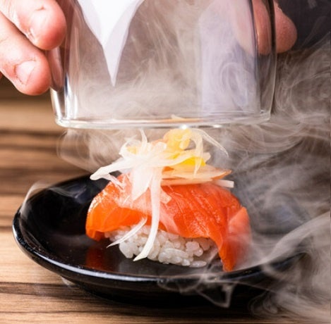 独特の風味がうまれ、うま味がアップする燻製スモークをまとったサーモン。ガラスのふたを開けると燻製の香ばしさが広がります。